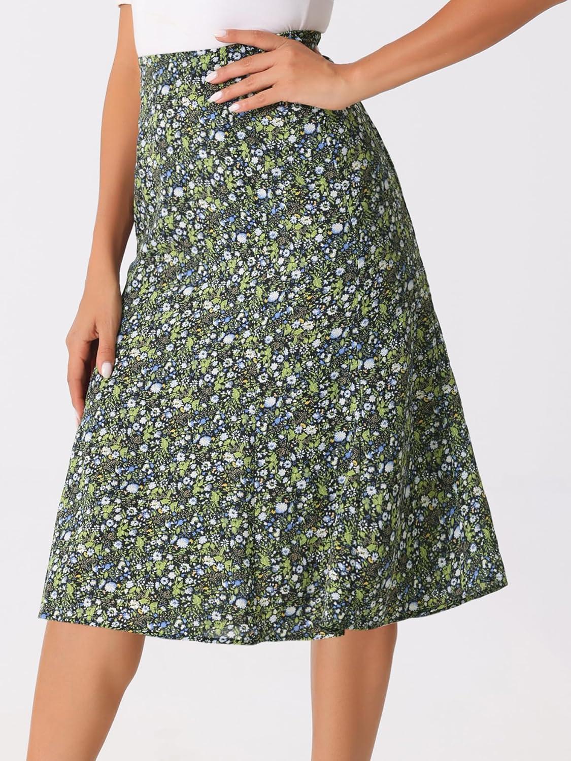 Allegra K Floral Skirt for Women’s Elastic Waist A-Line Midi Skirts(Black Green)