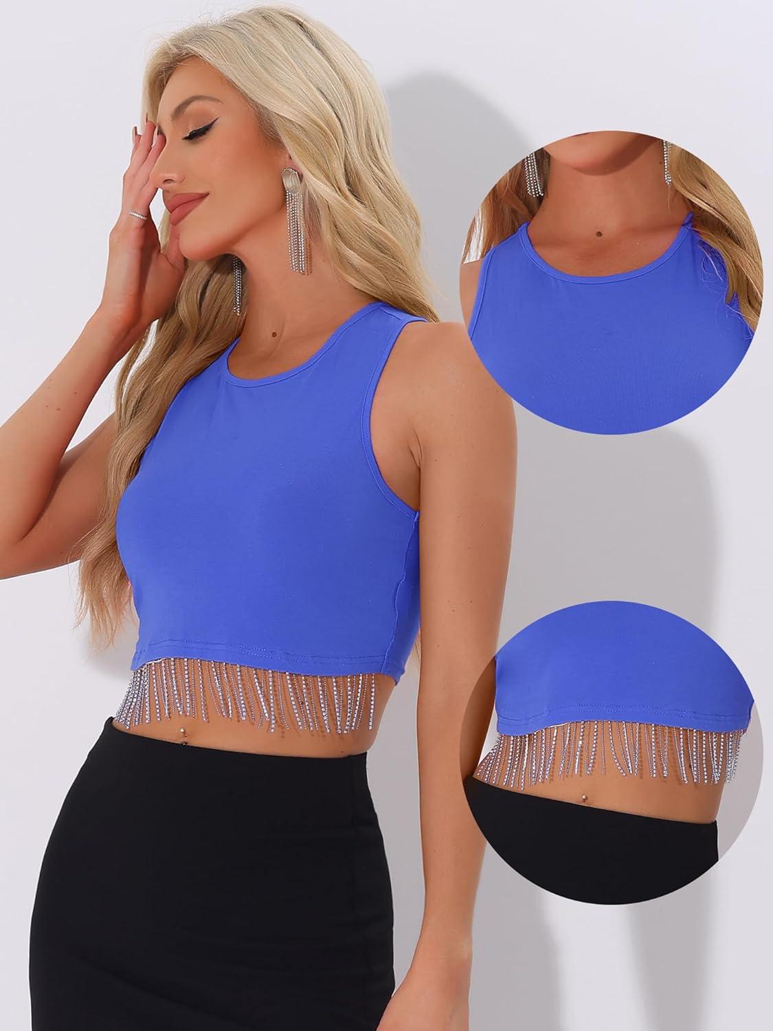 Allegra K Fringe Tops for Women's Y2K Raceback Top Sleeveless Sparkly Glitter Tassel Tank Crop Rhinestone Tops(Royal Blue)