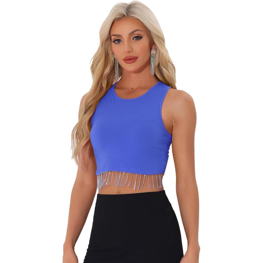 imageAllegra K Fringe Tops for Womens Y2K Raceback Top Sleeveless Sparkly Glitter Tassel Tank Crop Rhinestone TopsRoyal Blue
