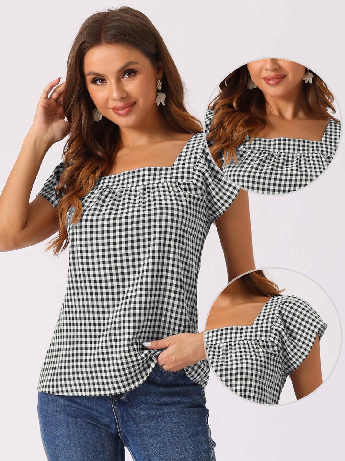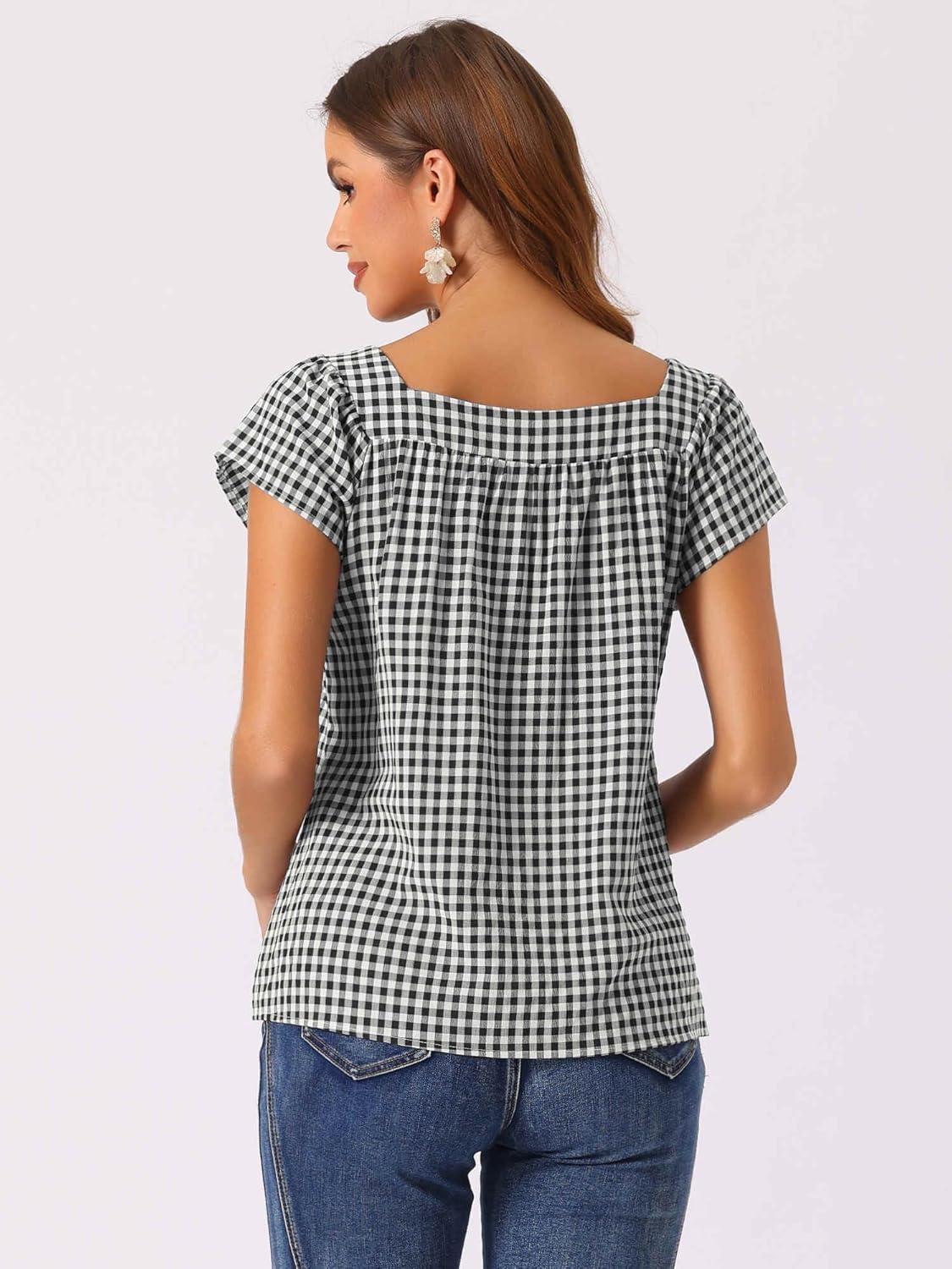 Allegra K Gingham Tops for Women Summer Cute Cap Sleeve Square Neck Plaid Shirts Casual Blouses(Black)