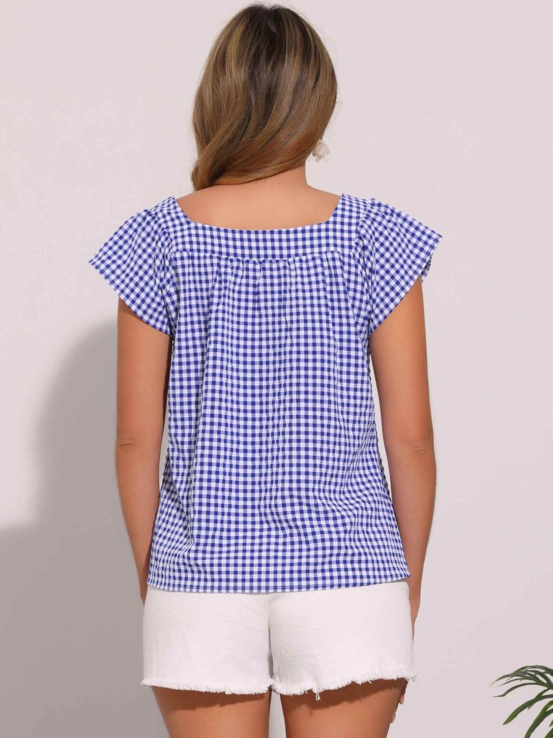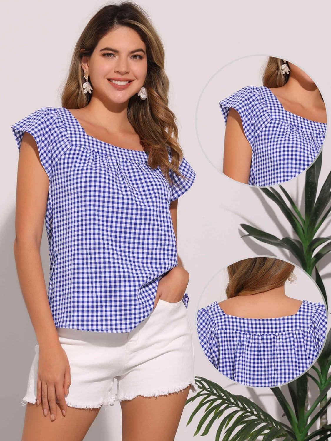 imageAllegra K Gingham Tops for Women Summer Cute Cap Sleeve Square Neck Plaid Shirts Casual BlousesBlue White