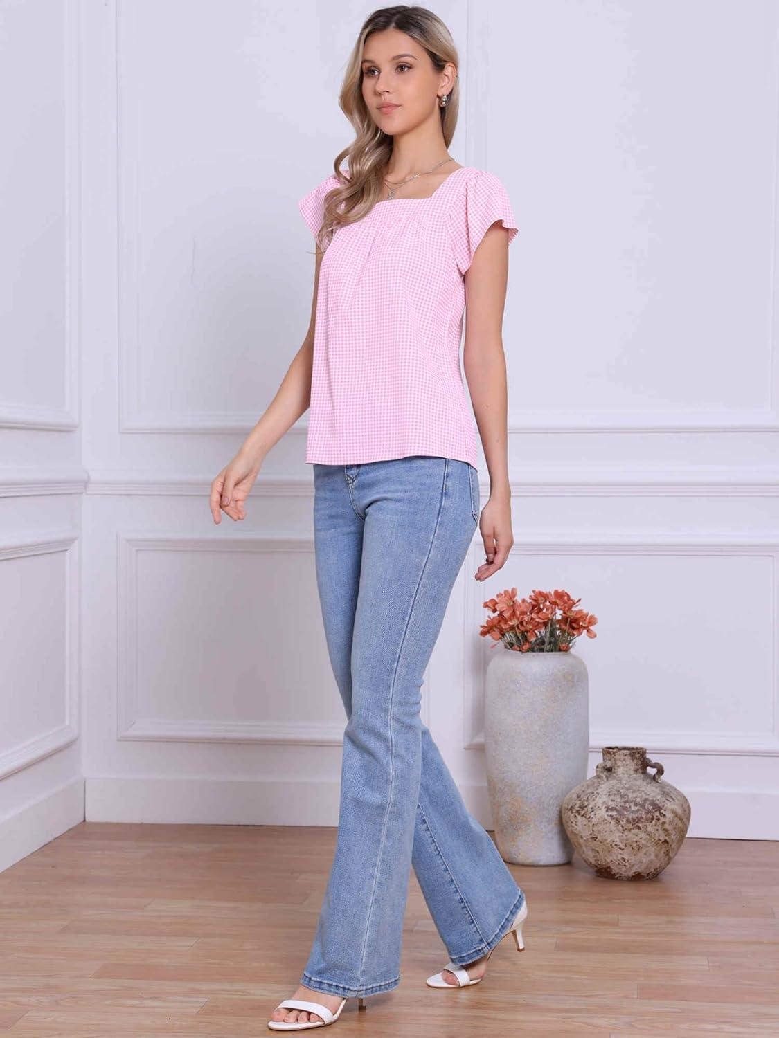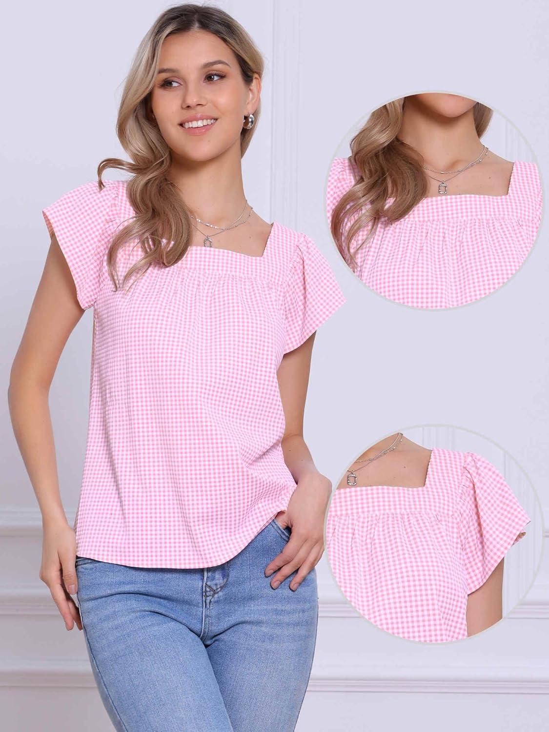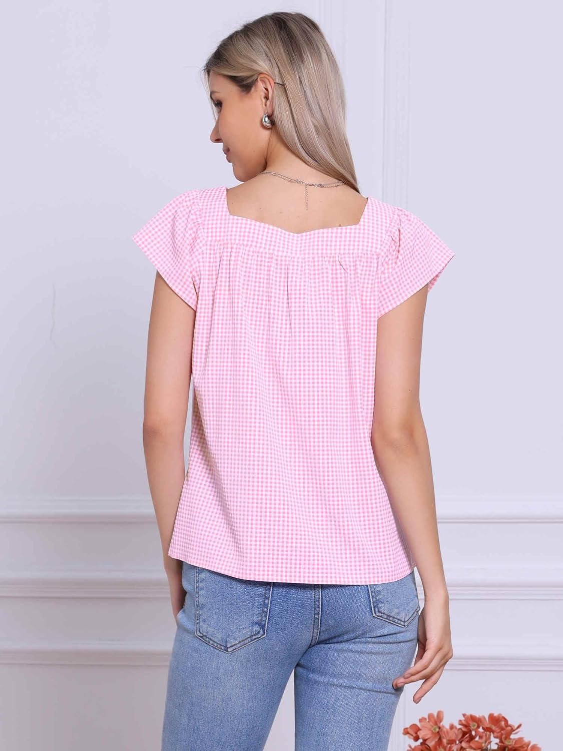 Allegra K Gingham Tops for Women Summer Cute Cap Sleeve Square Neck Plaid Shirts Casual Blouses(Pink)