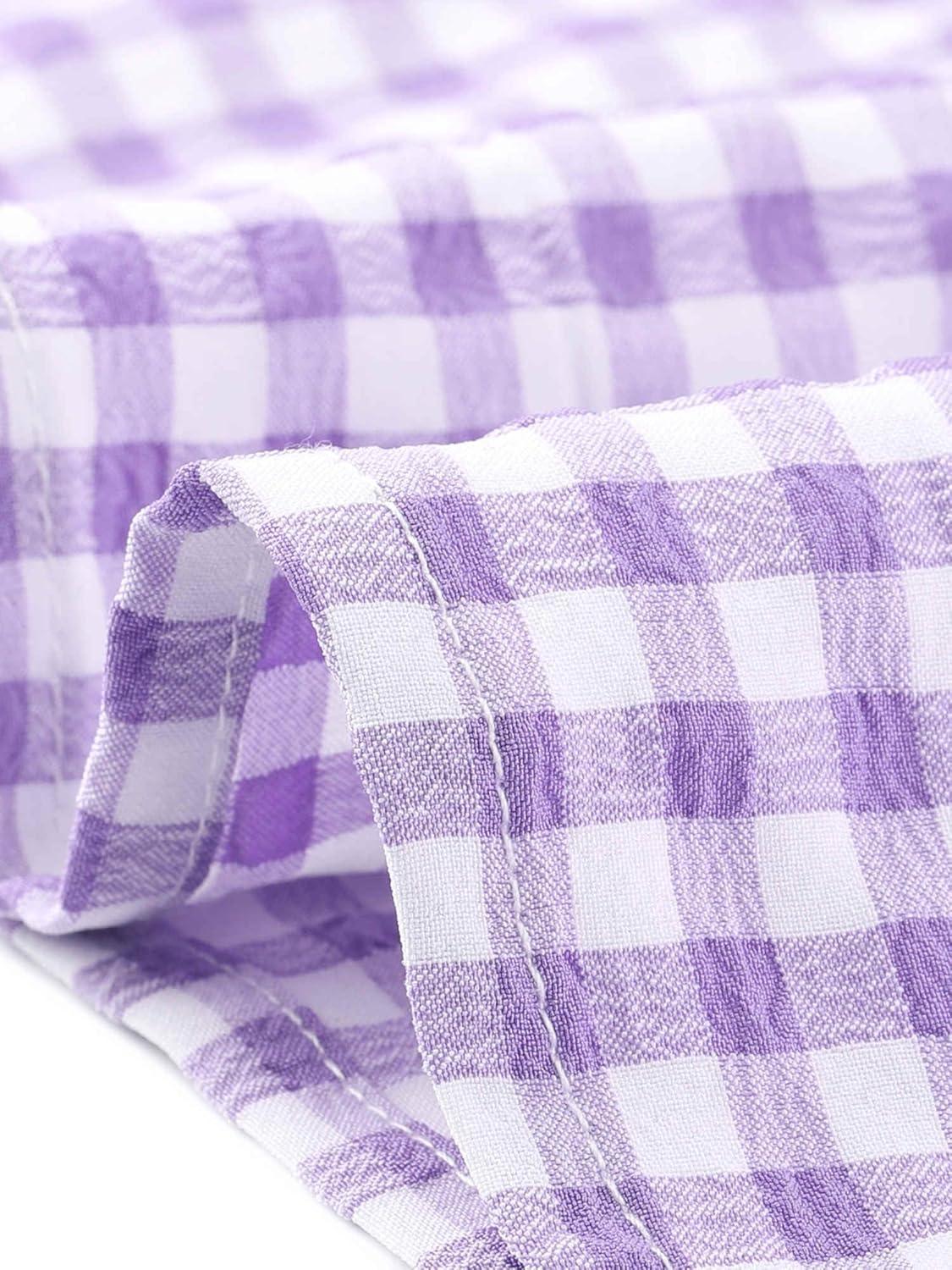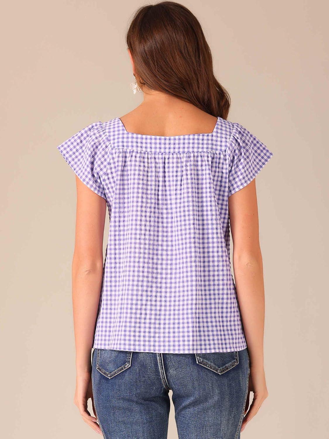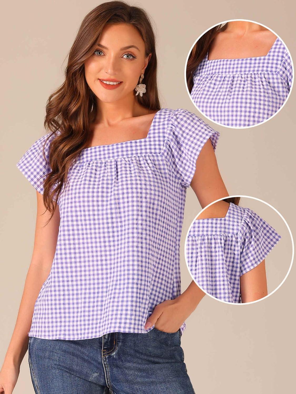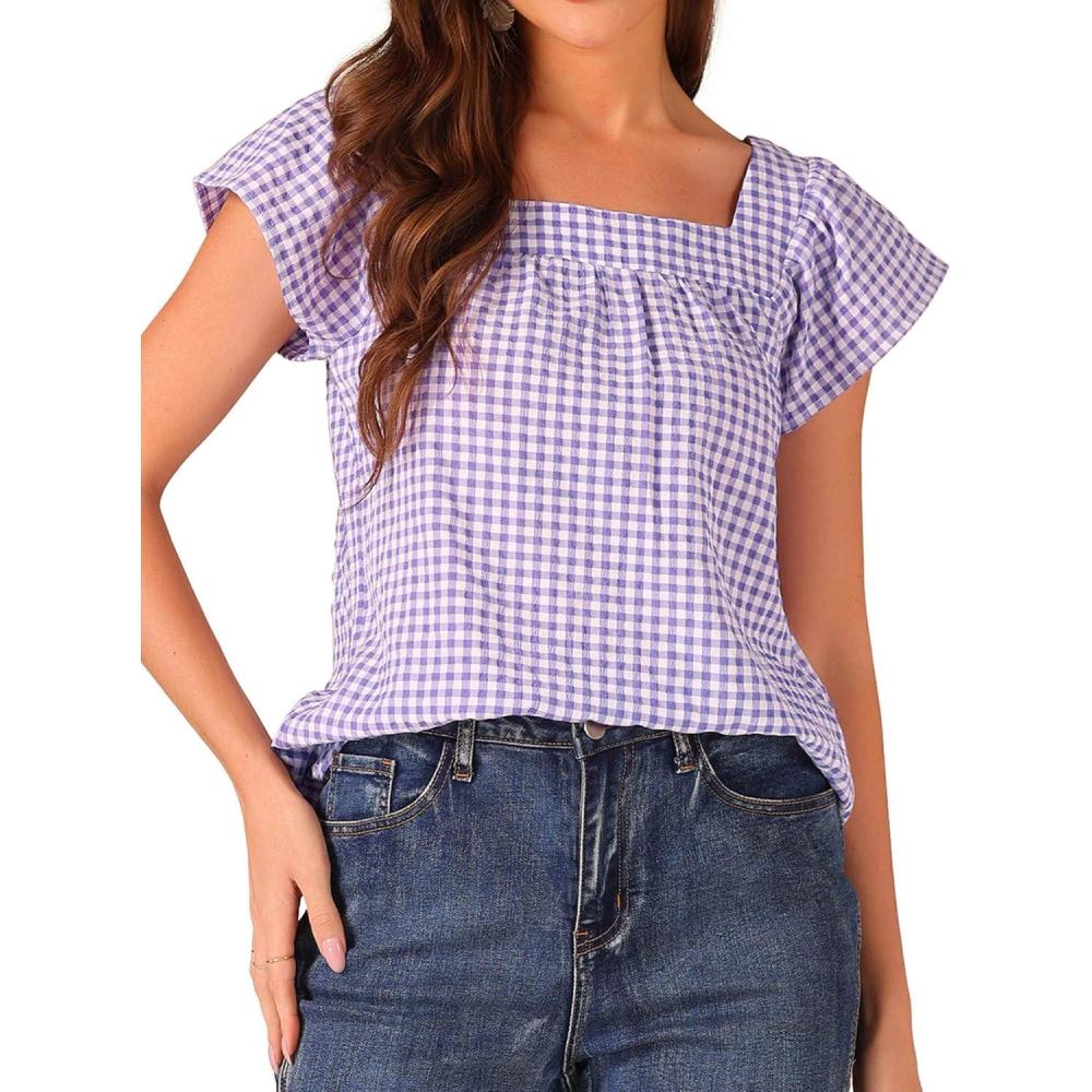 Allegra K Gingham Tops for Women Summer Cute Cap Sleeve Square Neck Plaid Shirts Casual Blouses(Purple)