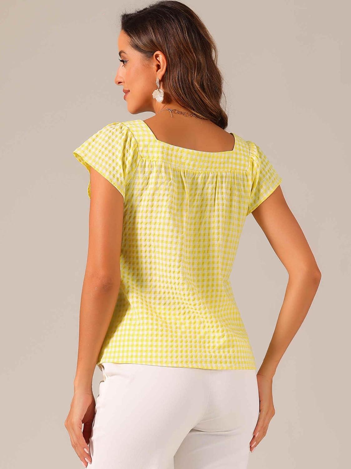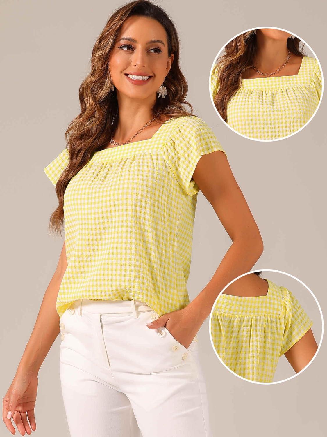 imageAllegra K Gingham Tops for Women Summer Cute Cap Sleeve Square Neck Plaid Shirts Casual BlousesYellow