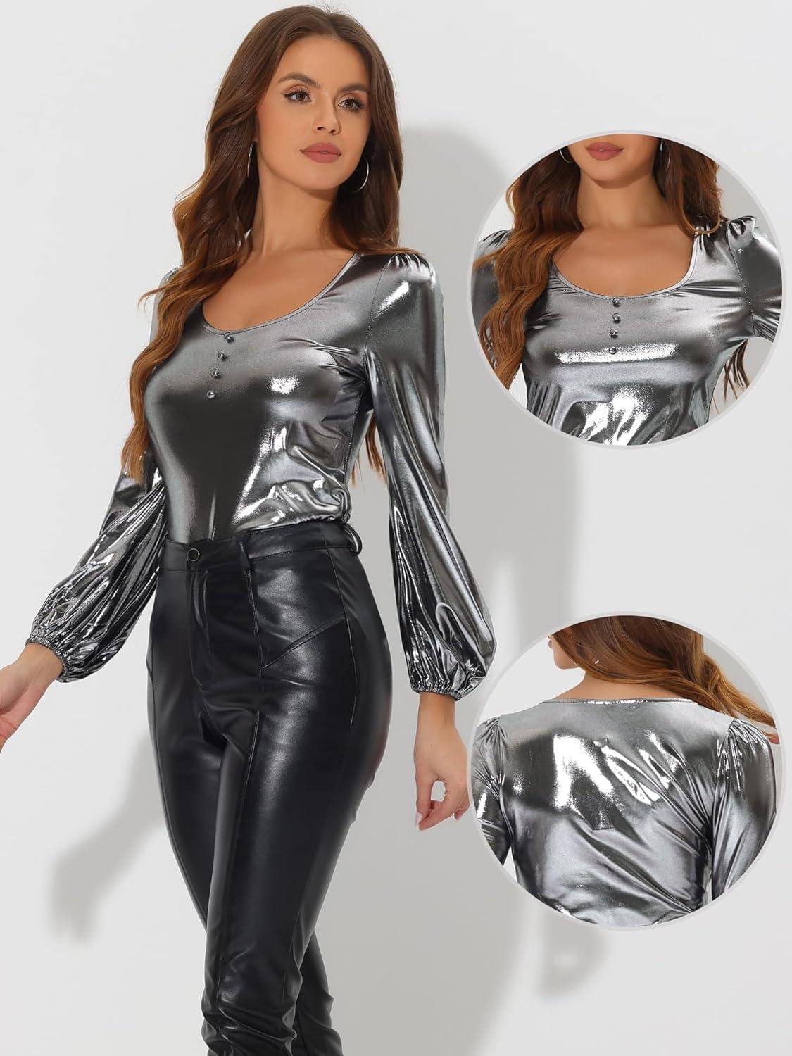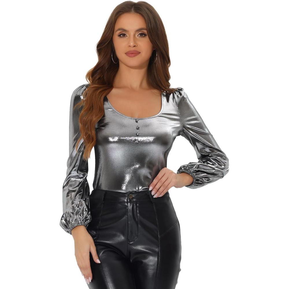 imageAllegra K Halloween Metallic Blouse for Womens Sparkly Party Shiny Bishop Sleeve Glitter TopsDark Silver