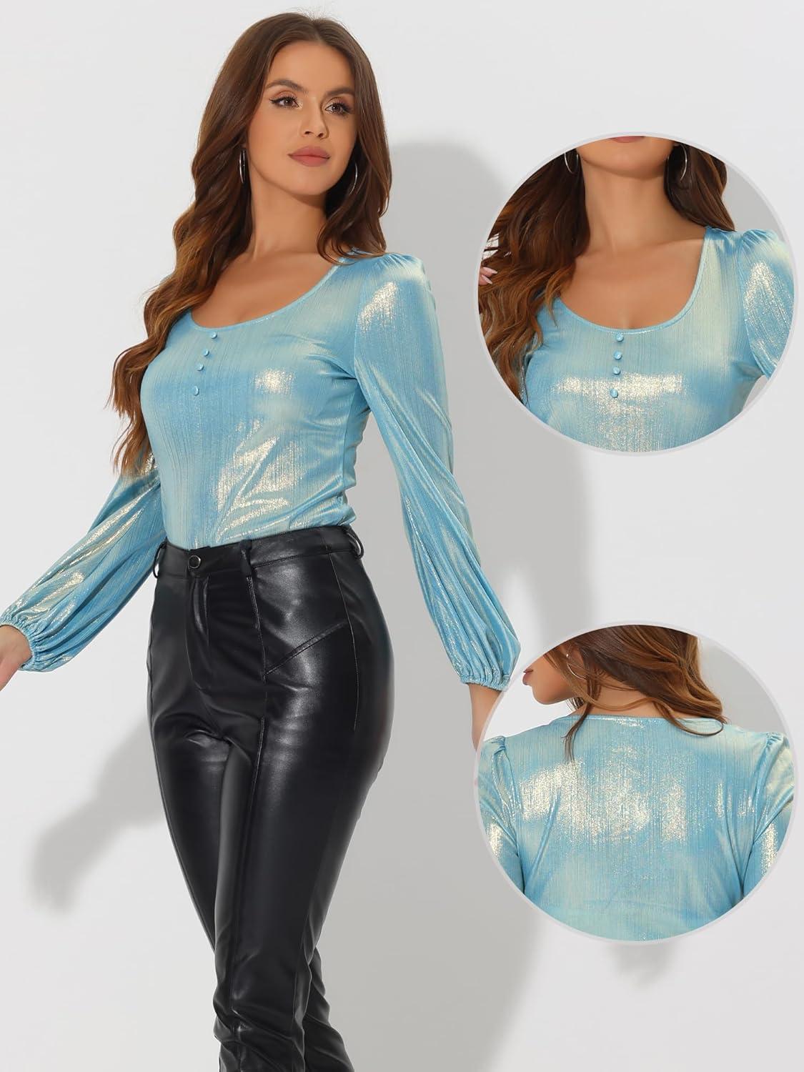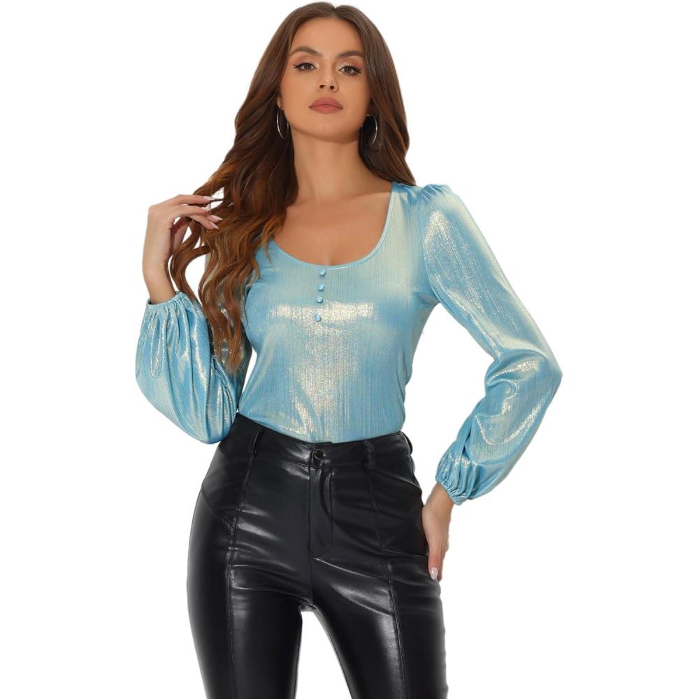 Allegra K Halloween Metallic Blouse for Women's Sparkly Party Shiny Bishop Sleeve Glitter Tops(Light Blue)