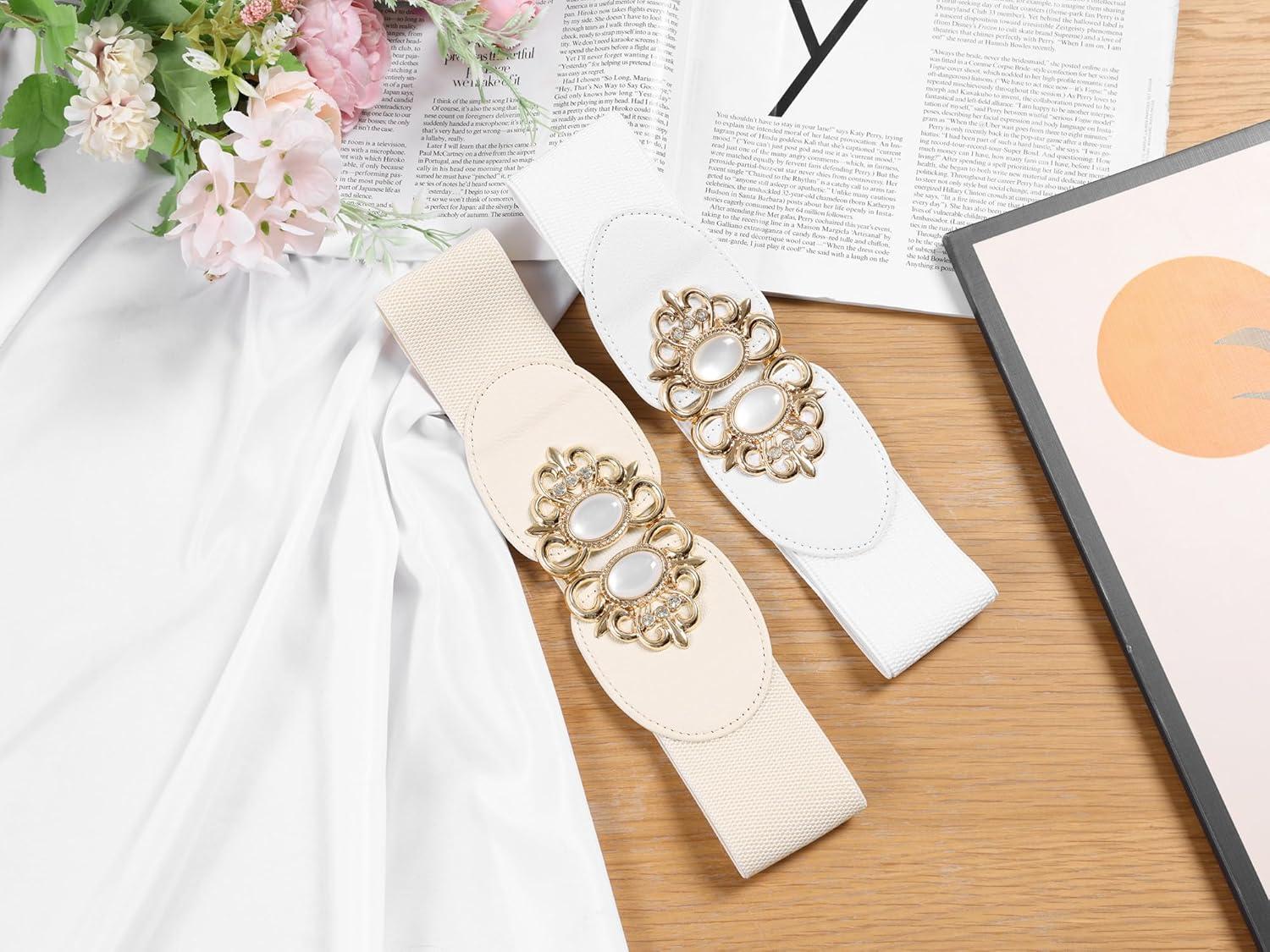 Allegra K Lady 2.36″ Width Elastic Belts, Faux Leather Opal Beaded Rhinestone Inlaid Stretchy Cinch Waistband for Dress(Beige)