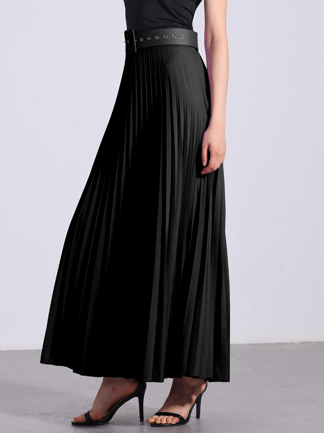 Allegra K Long Pleated Skirt for Women’s Elastic High Waist with Belt Swing A-line Work Maxi Skirt(Black)