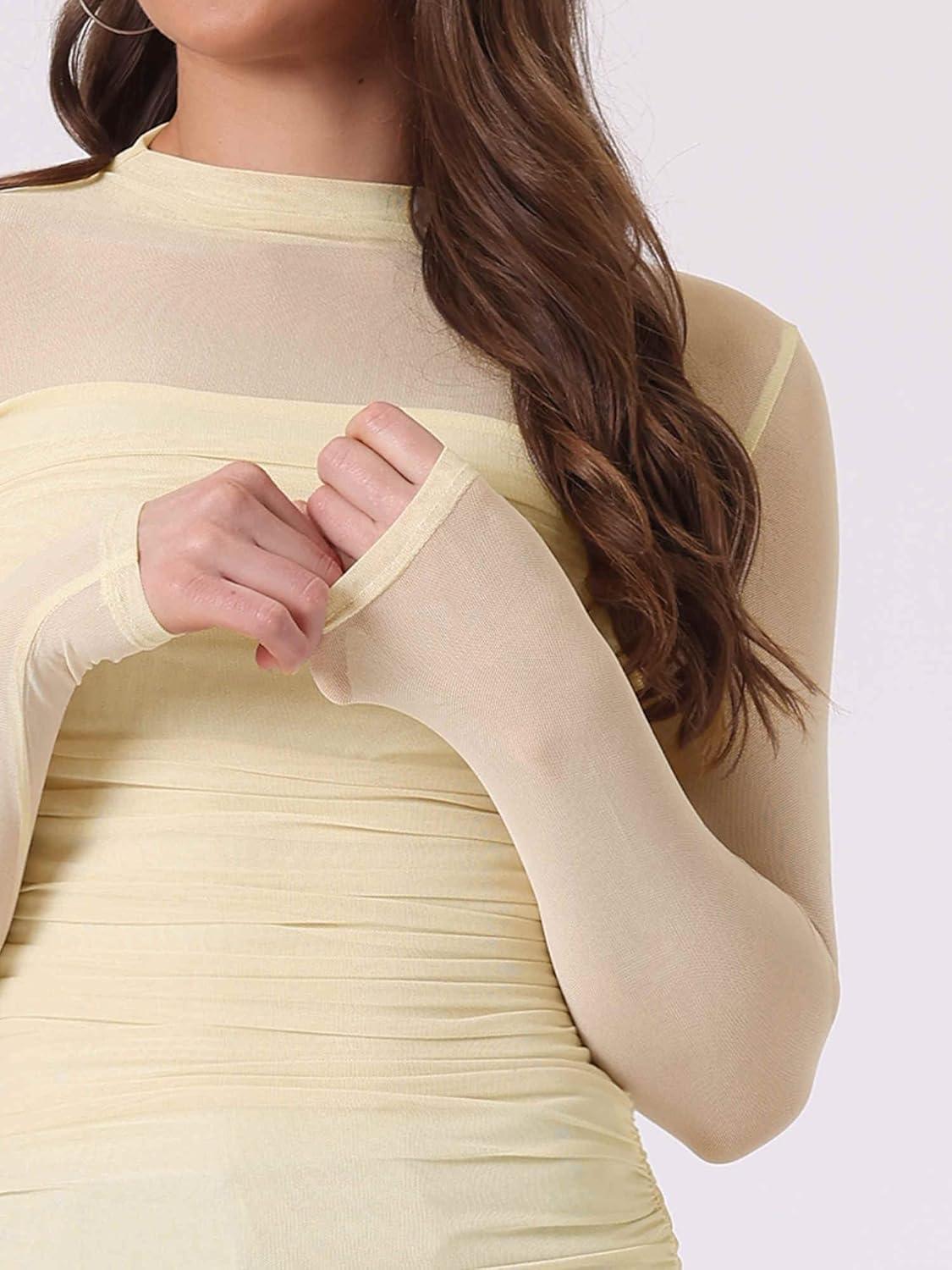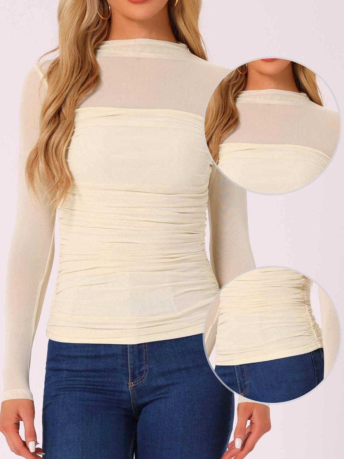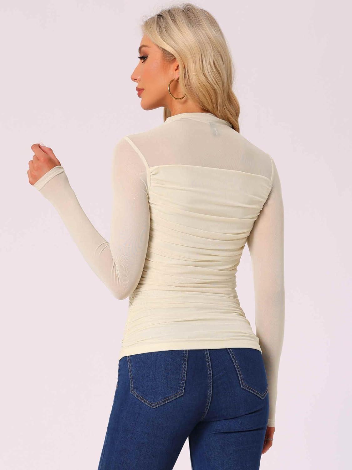 Allegra K Mesh Top Women Sheer Long Sleeve Mock Neck Slim Fit Shirts Trendy Fall Outfit Ruched Going Out Tops(Beige)