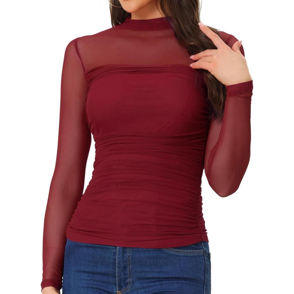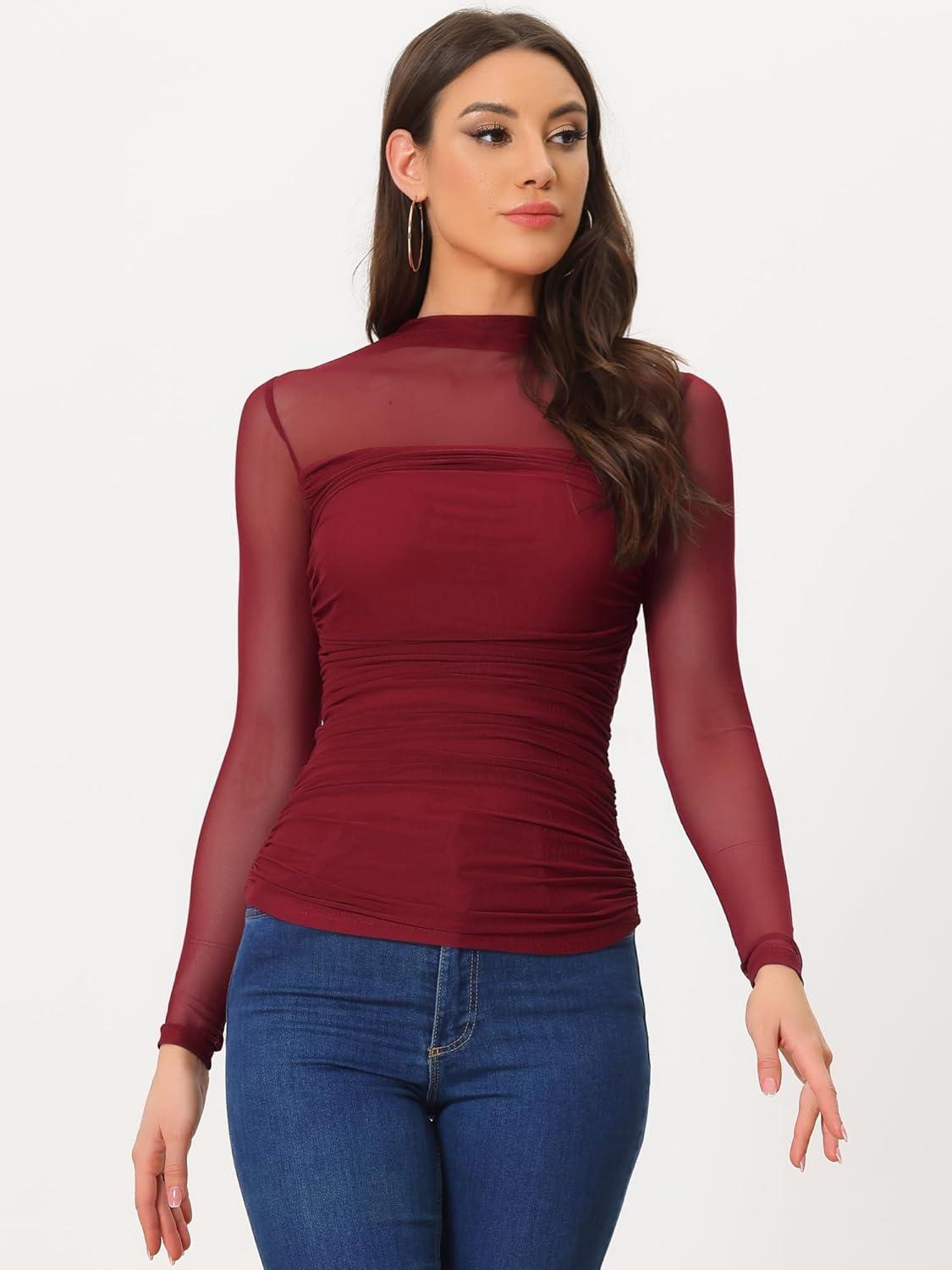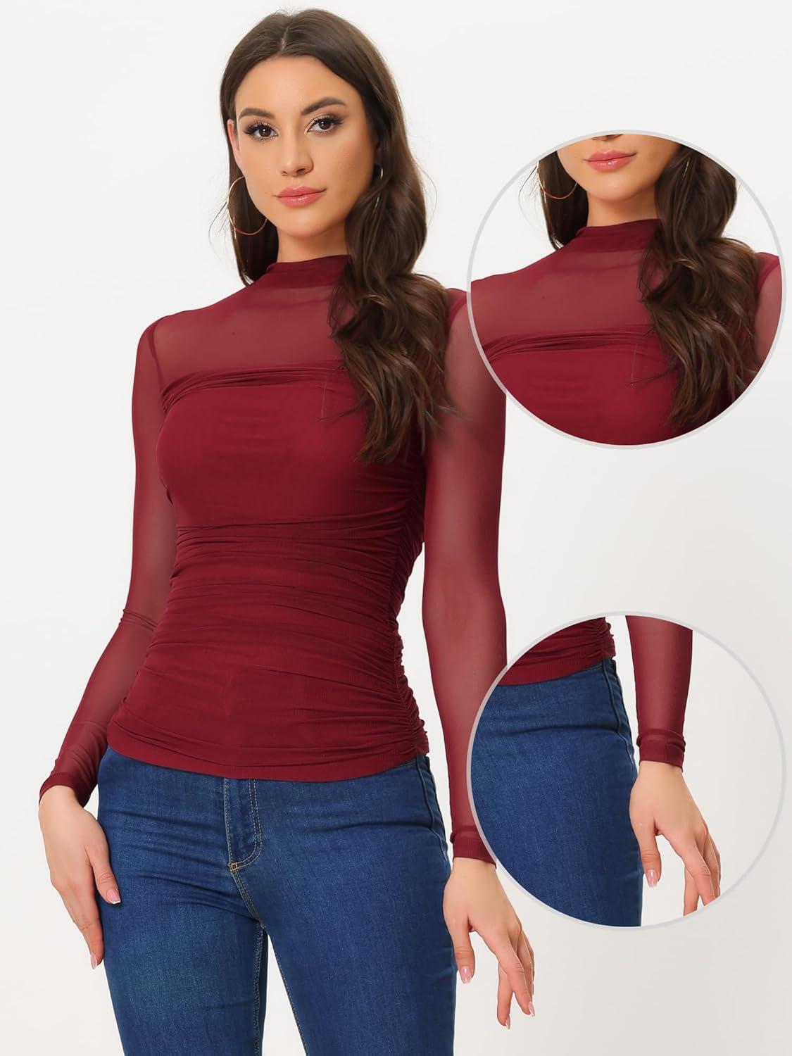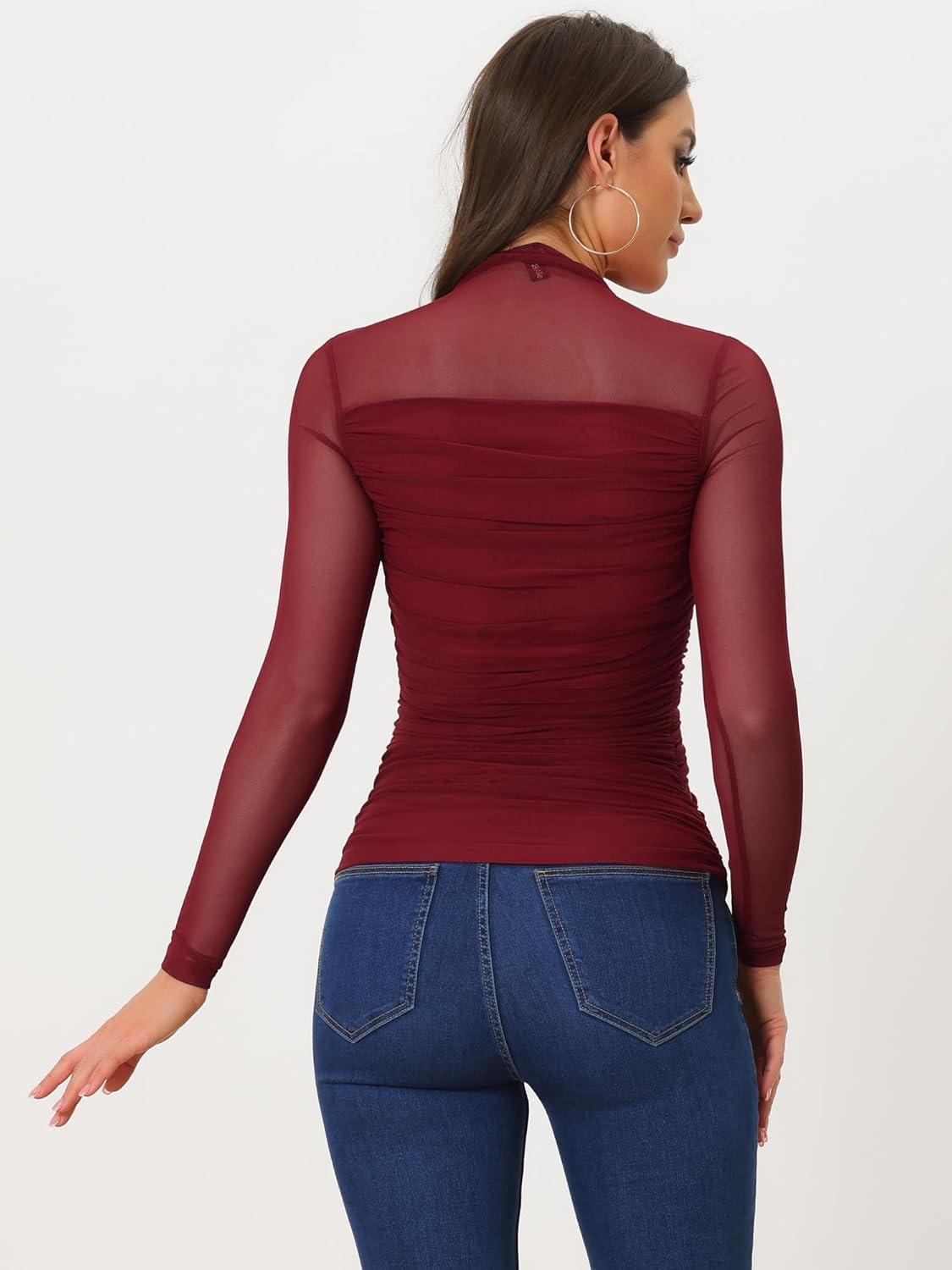 Allegra K Mesh Top Women Sheer Long Sleeve Mock Neck Slim Fit Shirts Trendy Fall Outfit Ruched Going Out Tops(Reds)