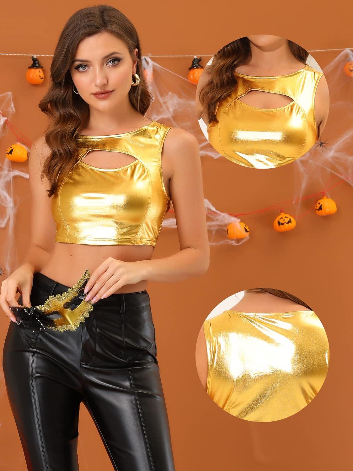 Allegra K Metallic Crop Top for Women’s Sleeveless Cut Out Party Clubwear Holographic Tank Tops(Gold)