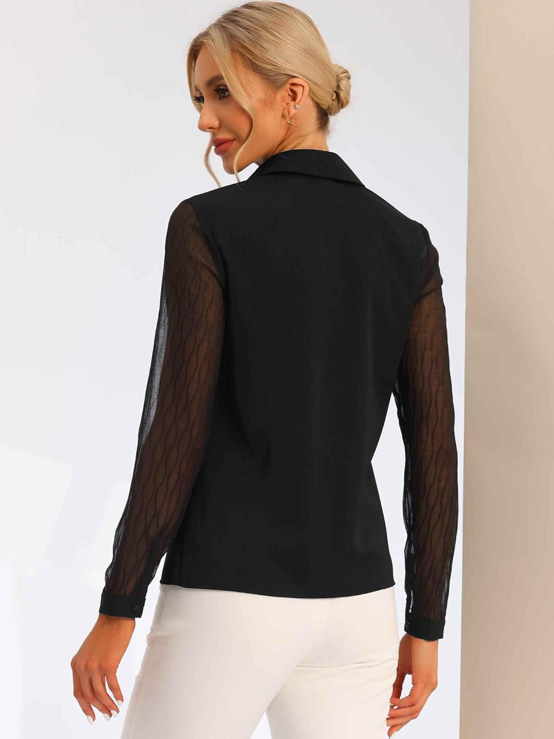 Allegra K Office Blouse for Women's Point Collar V Neck Button Down Mesh Sleeve Work Shirt(Black)