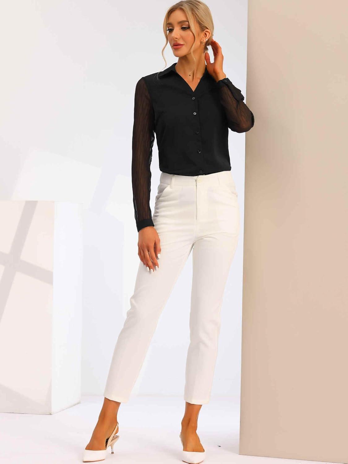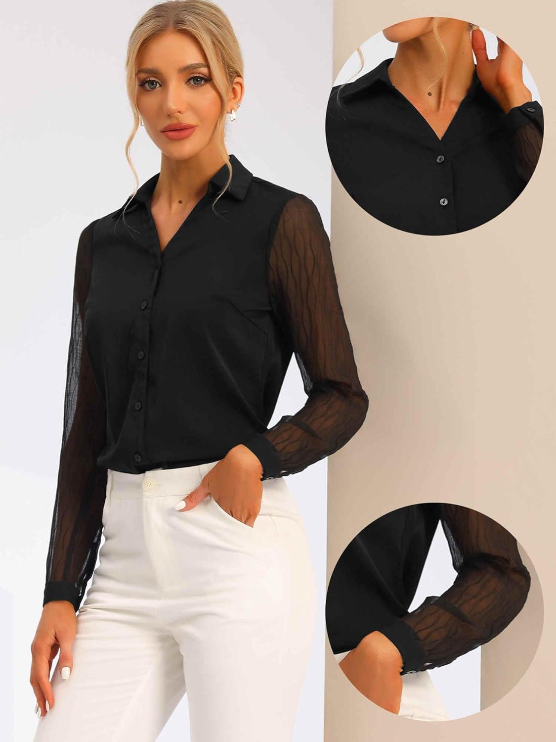 Allegra K Office Blouse for Women’s Point Collar V Neck Button Down Mesh Sleeve Work Shirt(Black)