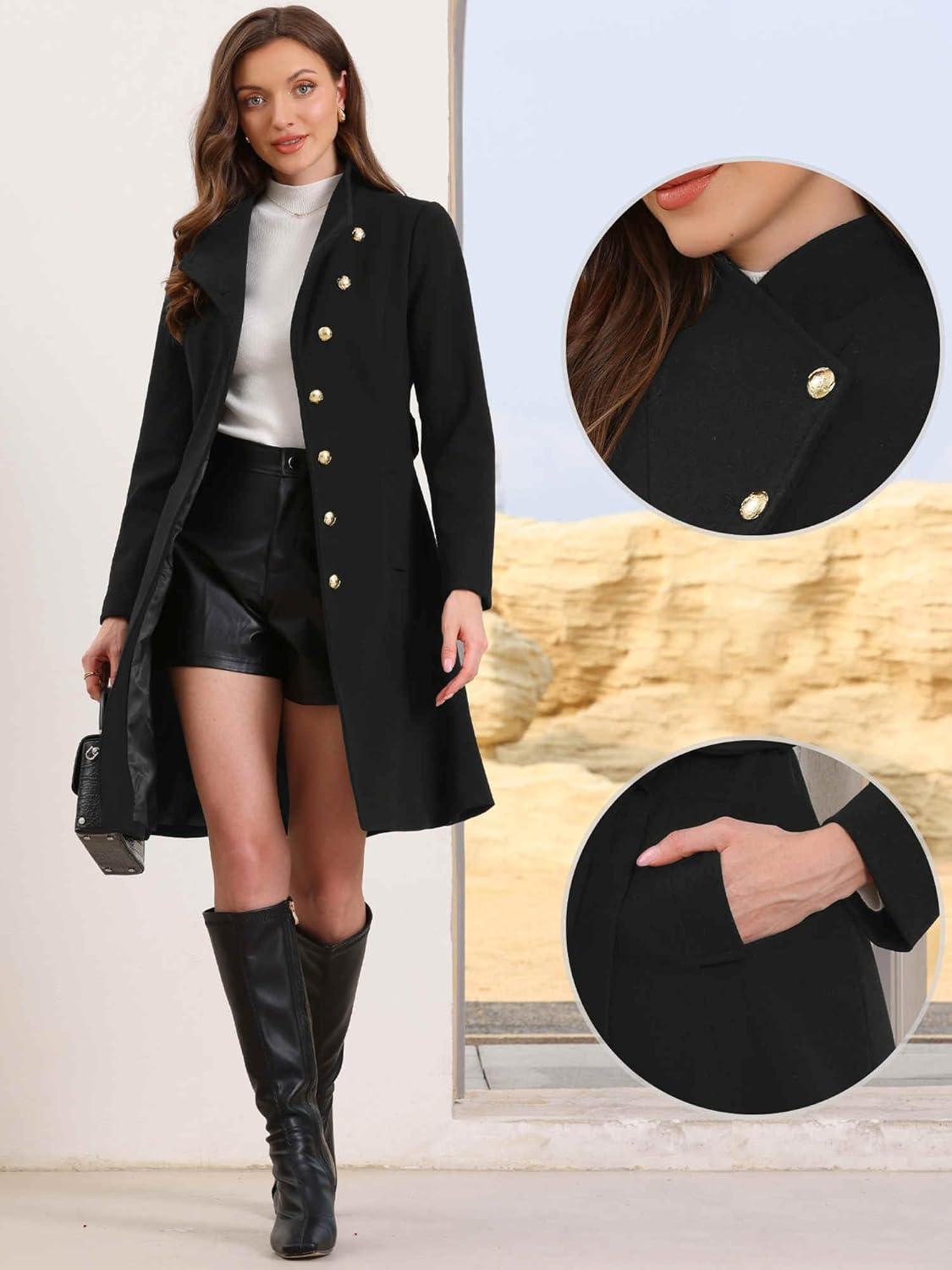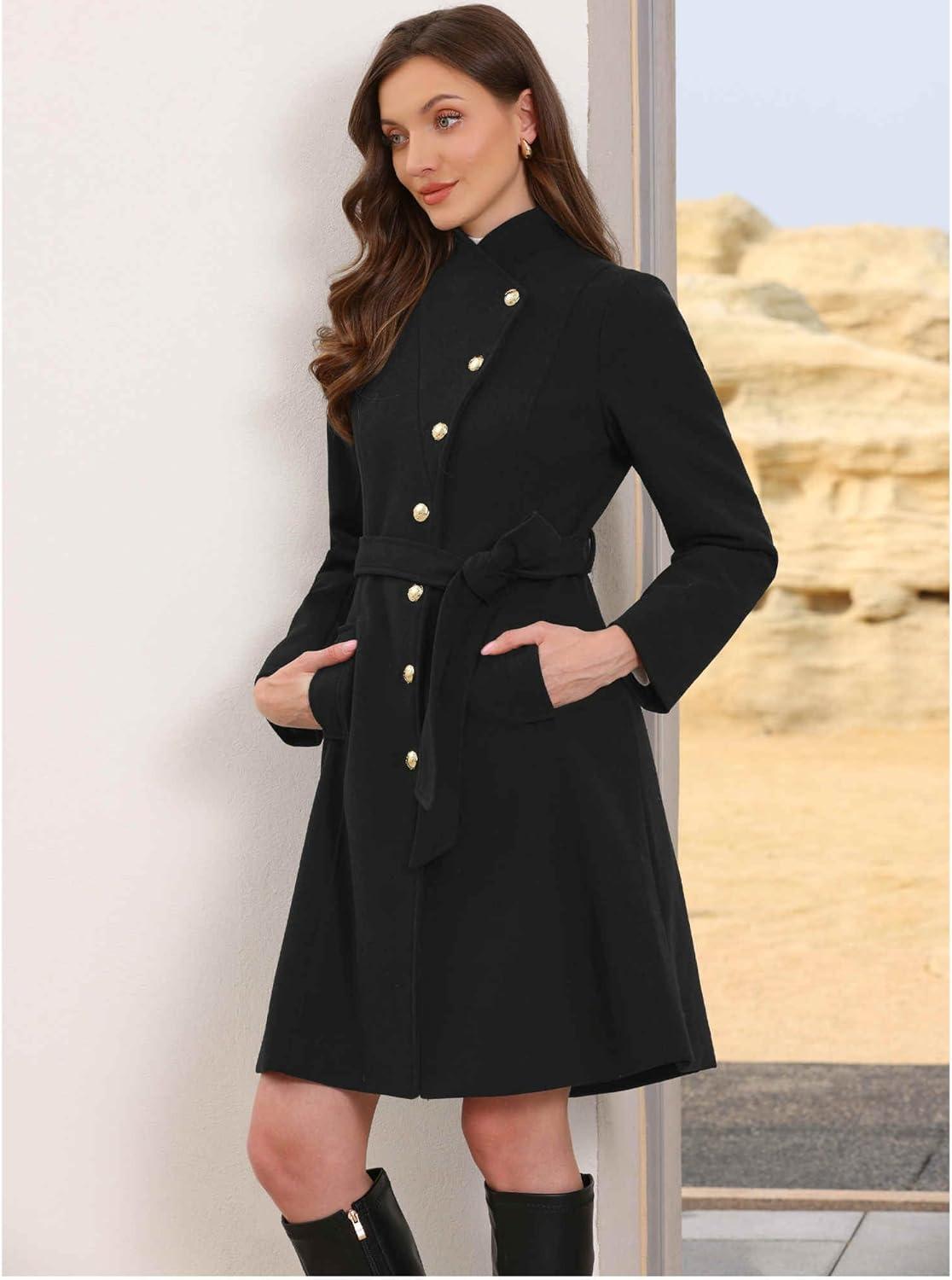 Allegra K Pea Coat for Women Winter Stand Collar Button Down Mid Long Coats Outerwear with Belt