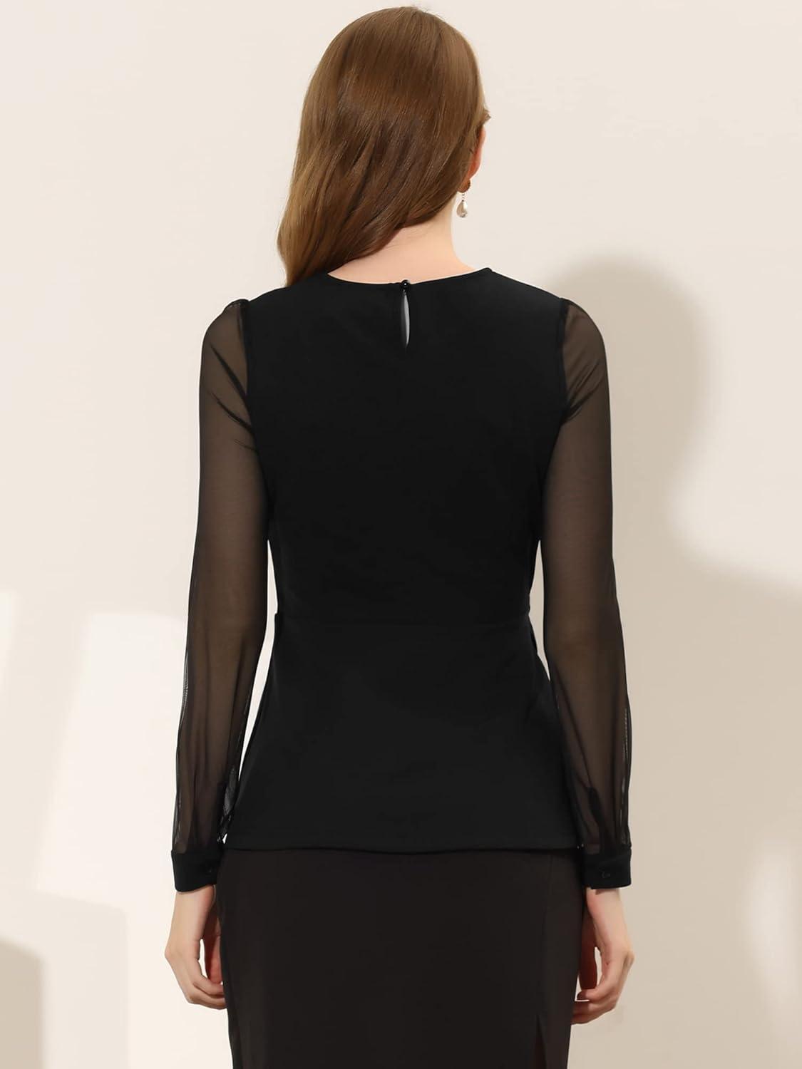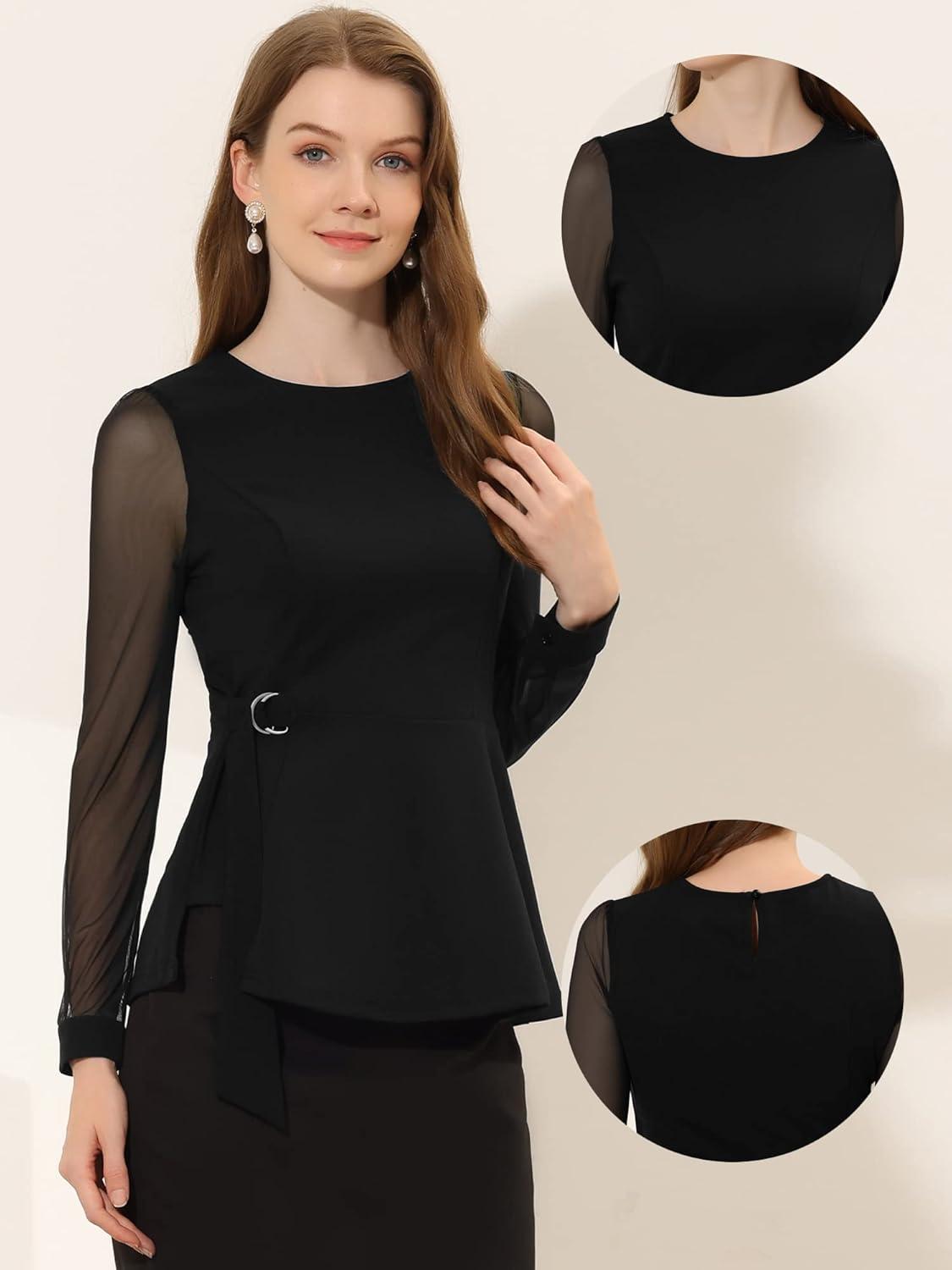 Allegra K Peplum Blouse for Women's Mesh Sheer Long Sleeve Round Neck Belted Work Top(Black)
