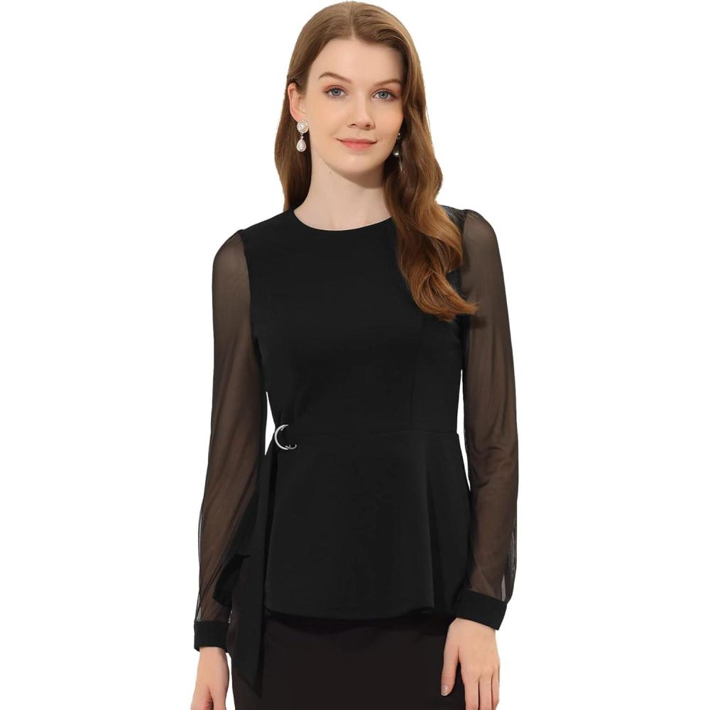 imageAllegra K Peplum Blouse for Womens Mesh Sheer Long Sleeve Round Neck Belted Work TopBlack