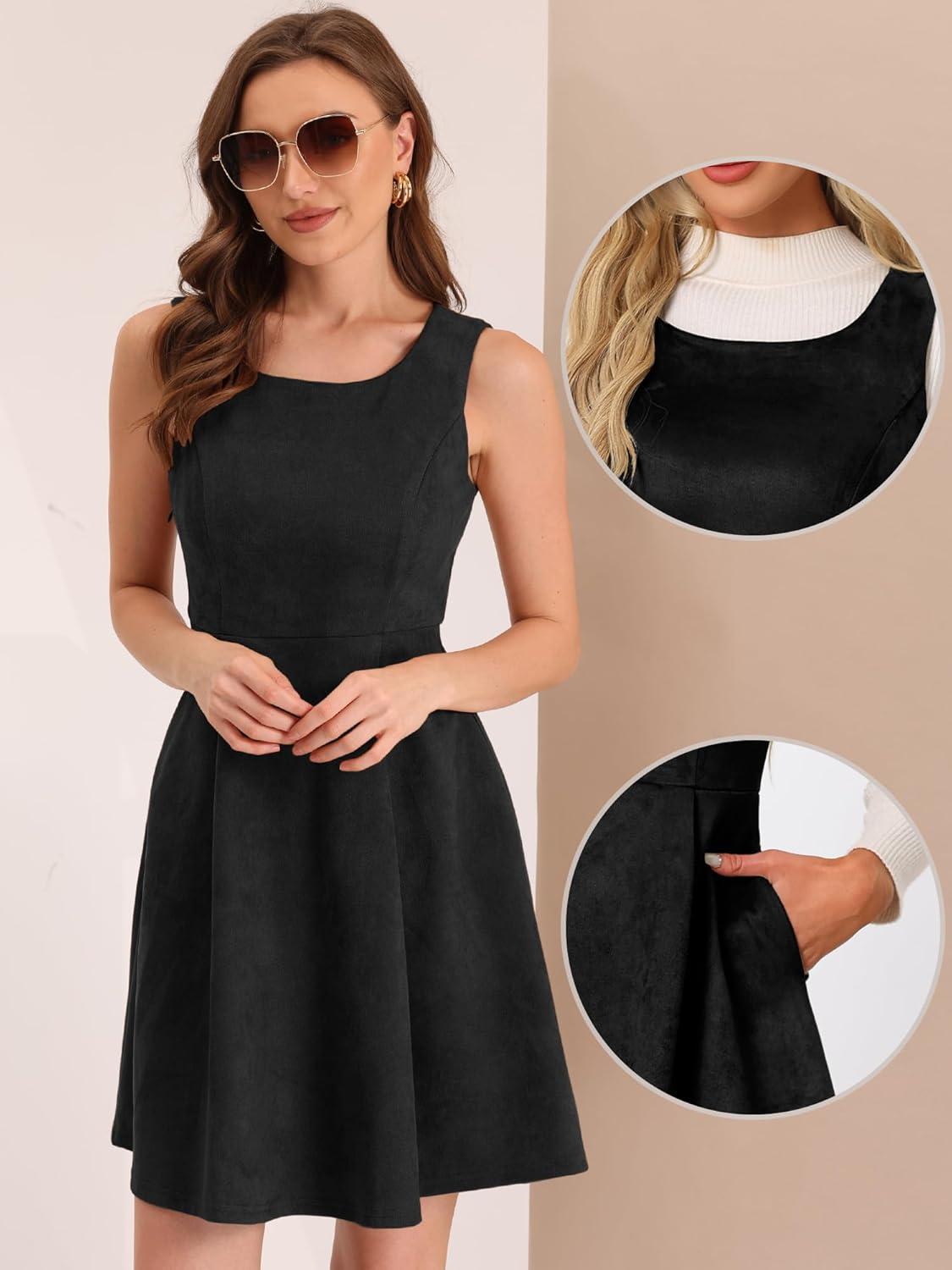 Allegra K Pinafore Dress for Women’s Sleeveless Casual Vintage Faux Suede t Shirt Dresses(Black)