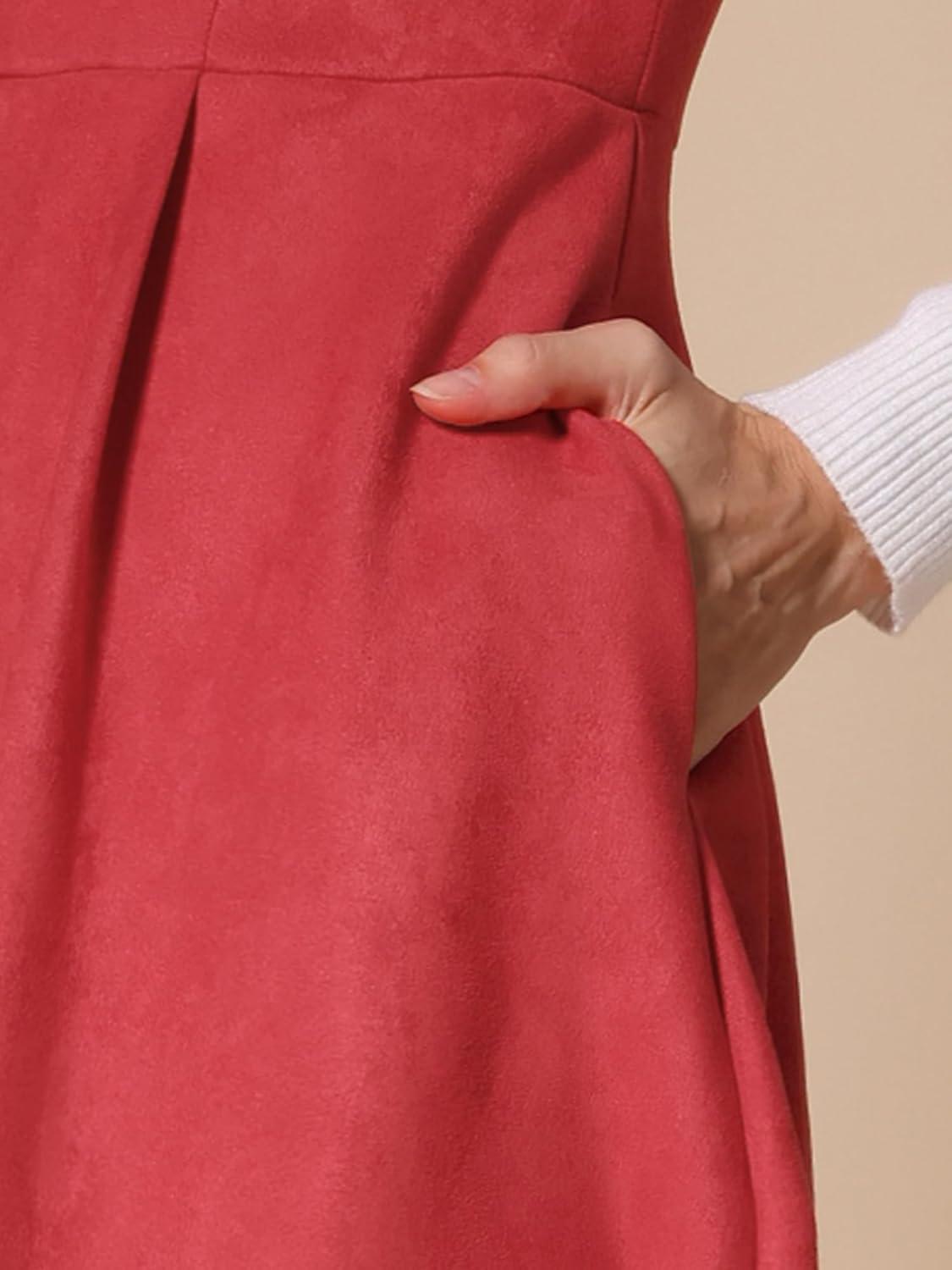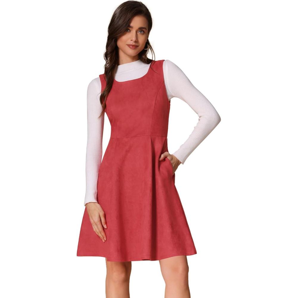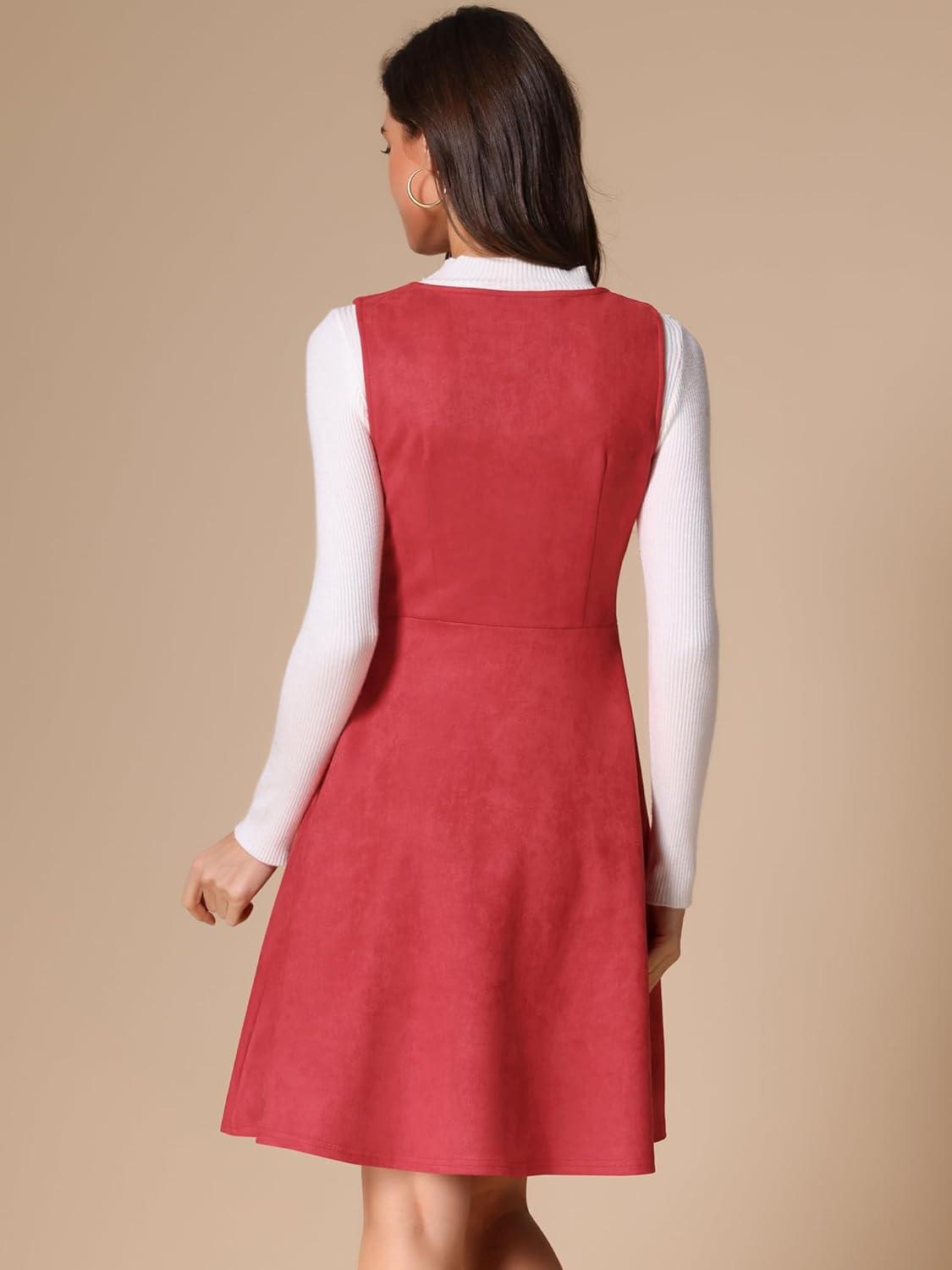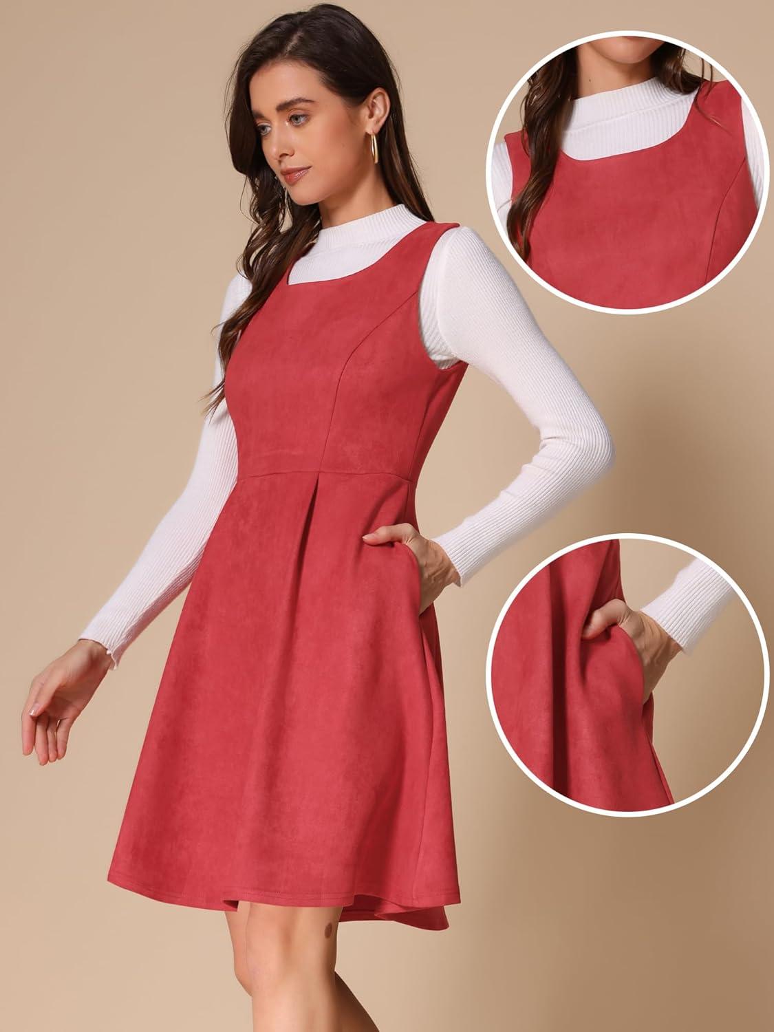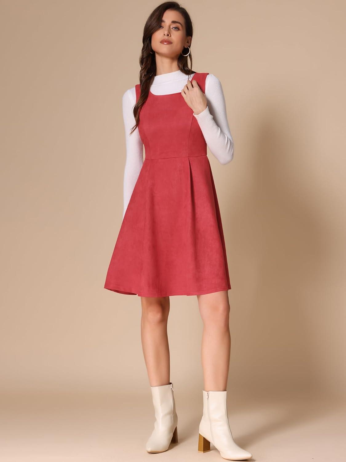 Allegra K Pinafore Dress for Women’s Sleeveless Casual Vintage Faux Suede t Shirt Dresses(Red)