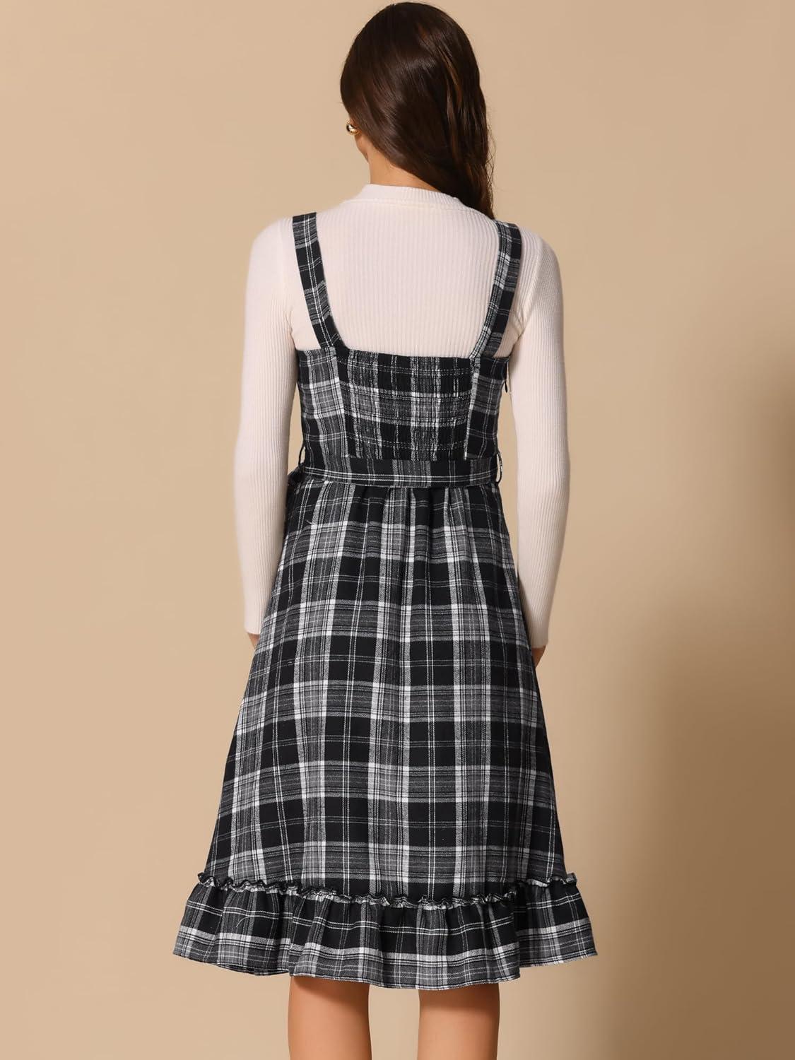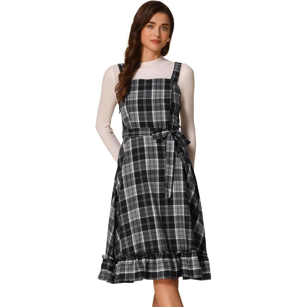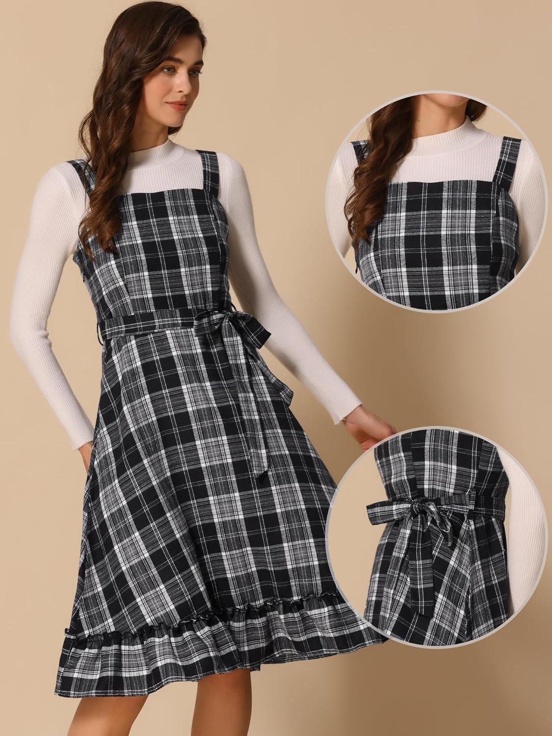 imageAllegra K Plaid Dress for Women Ruffled Sleeveless Vintage Tie Waist ALine Pinafore Overall DressesBlack White