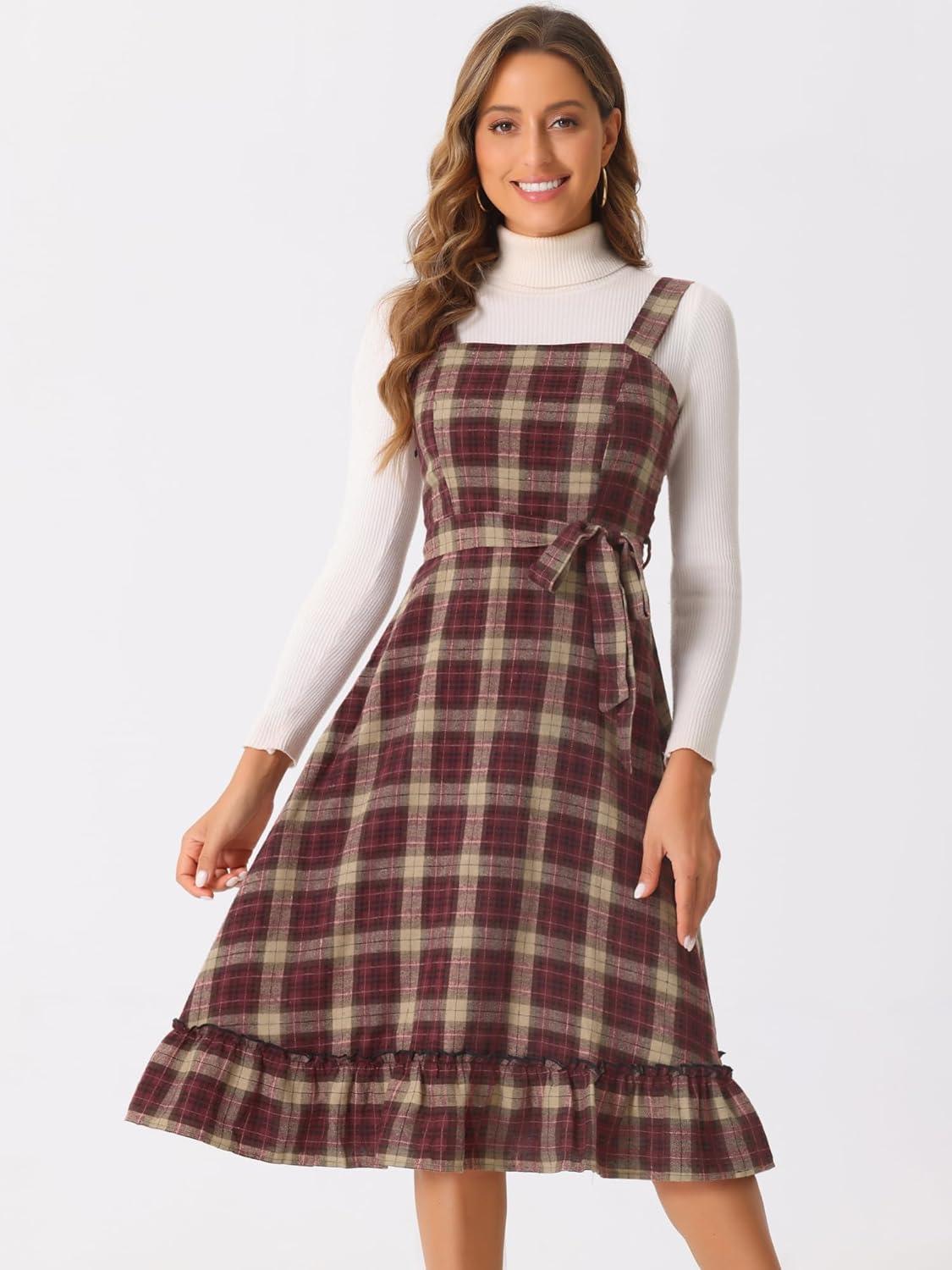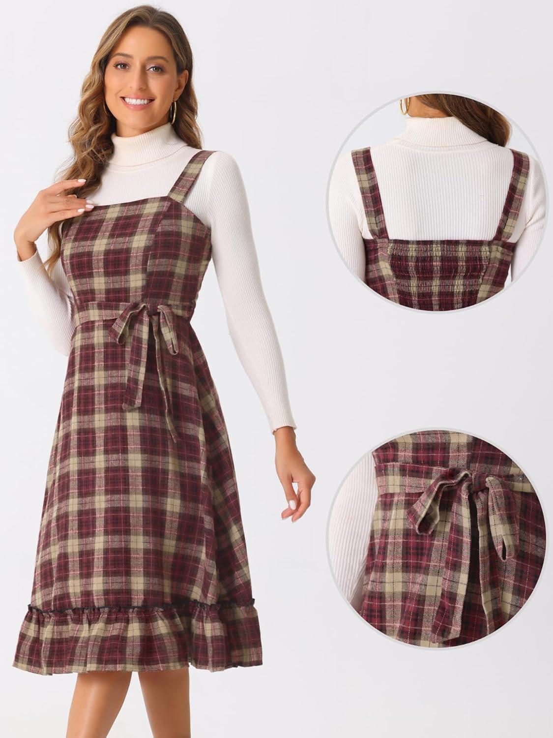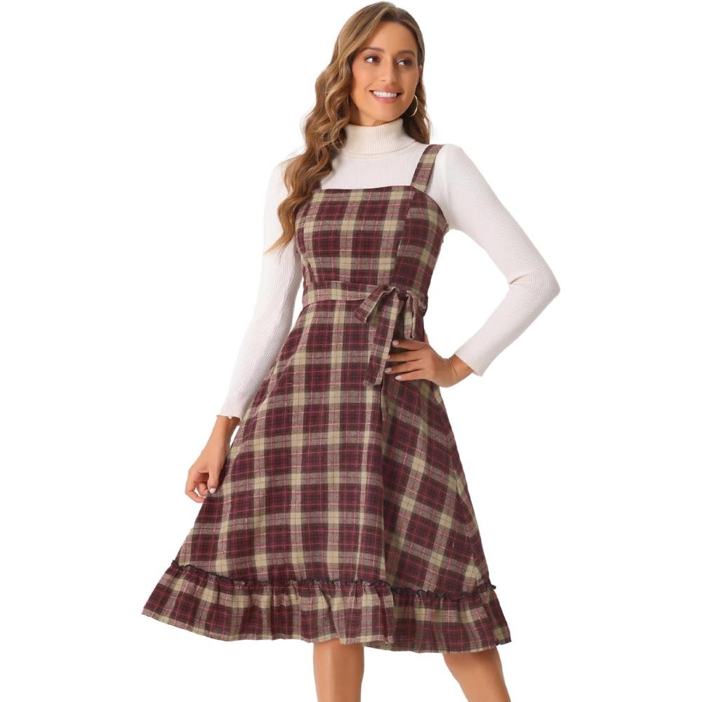 imageAllegra K Plaid Dress for Women Ruffled Sleeveless Vintage Tie Waist ALine Pinafore Overall DressesRed