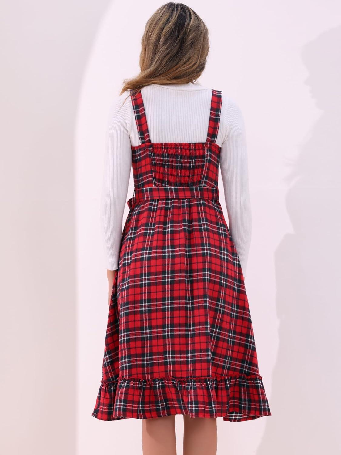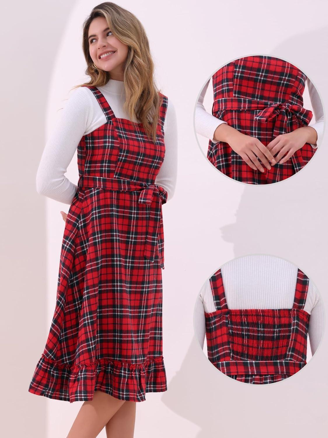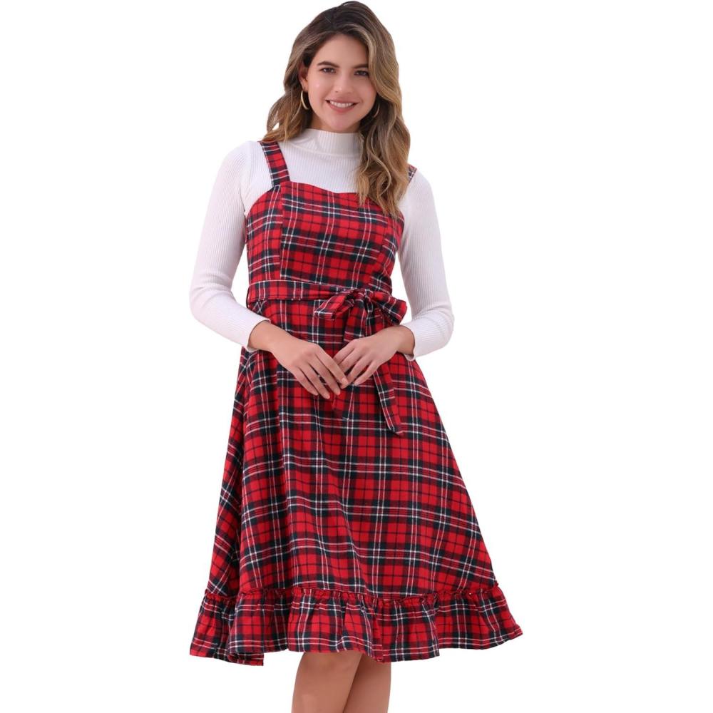 imageAllegra K Plaid Dress for Women Ruffled Sleeveless Vintage Tie Waist ALine Pinafore Overall DressesRed