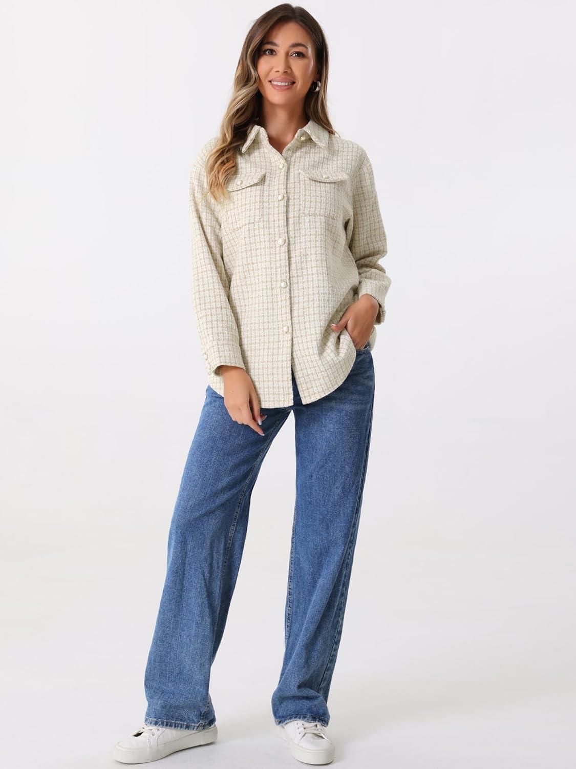 Allegra K Plaid Jacket for Women’s Tweed Long Sleeve Button Down Loose Winter Shacket Jacket(White)