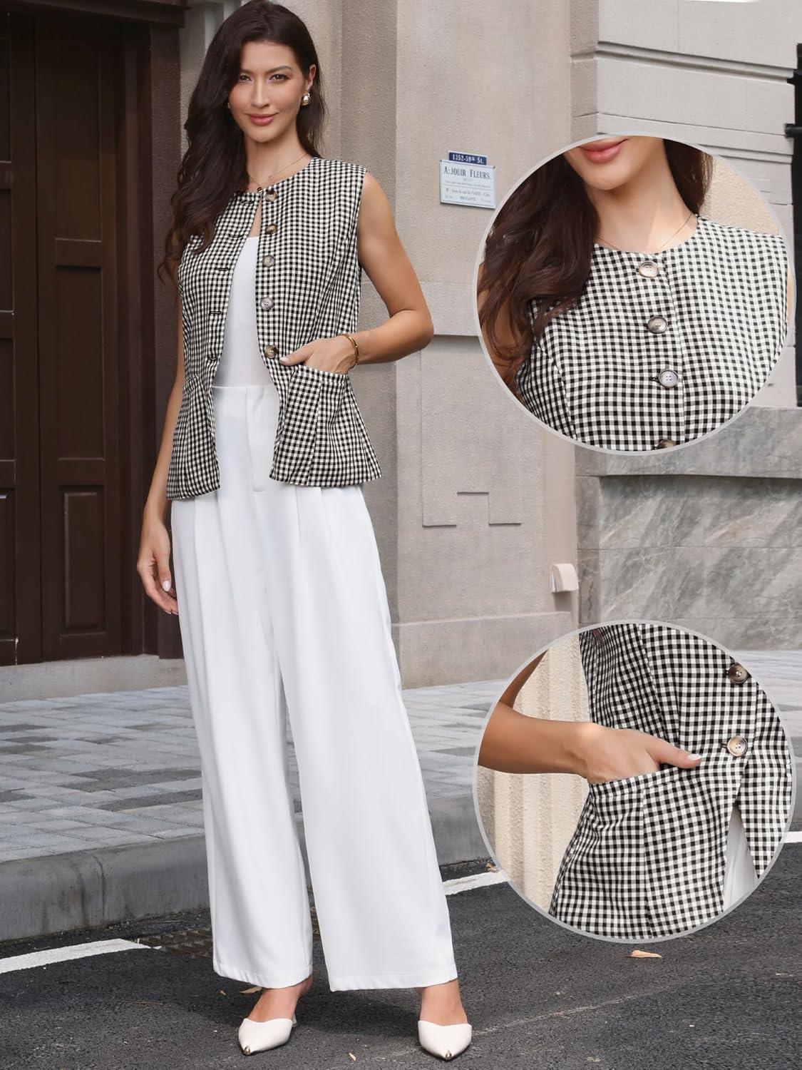 Allegra K Plaid Vest Top for Women’s Gingham Button Down Sleeveless Office Crew Neck Dressy Waistcoat(Black)