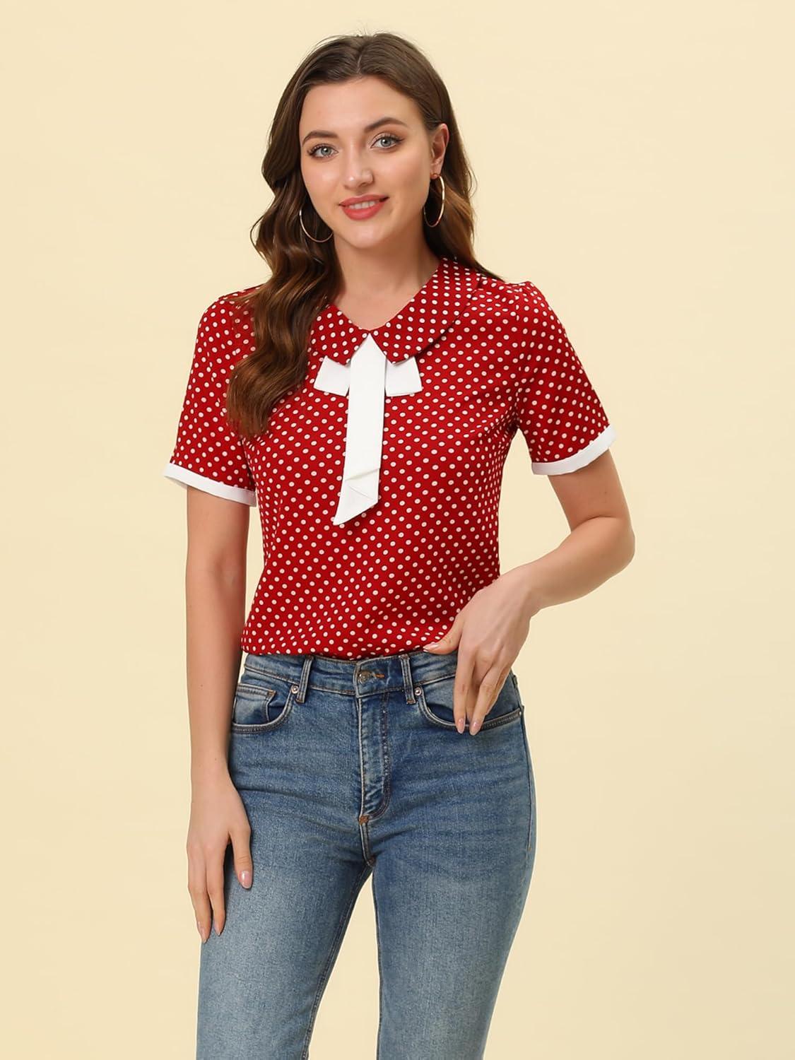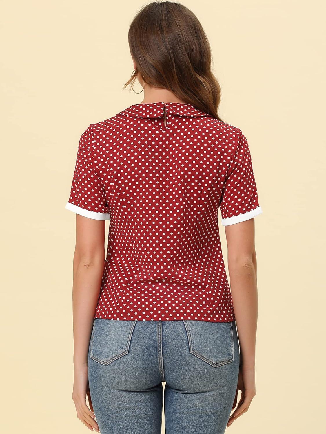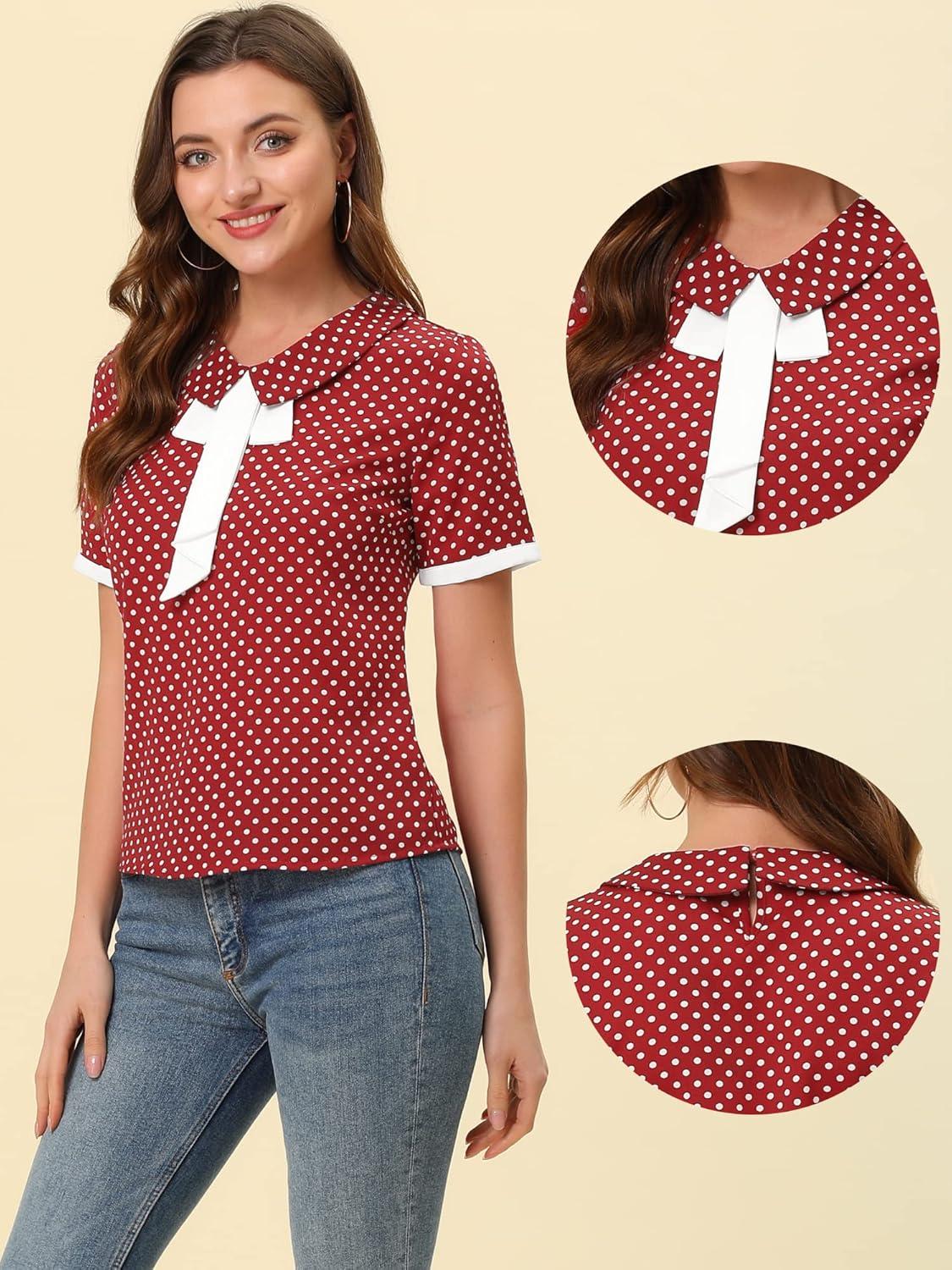 Allegra K Polka Dots Blouse for Women’s Contrast Tie Peter Pan Collar Vintage Shirt(Burgundy)