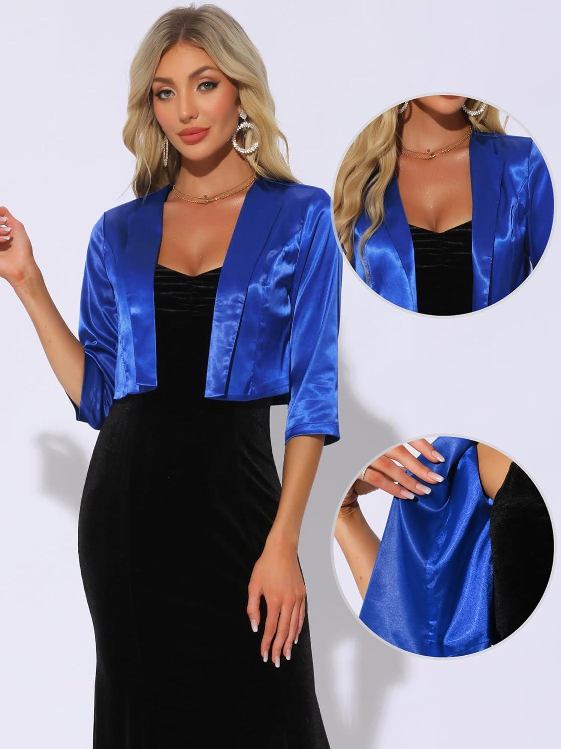 Allegra K Satin Cardigan for Women’s Open Front Elegant Formal 3/4 Sleeve Bolero Shrug Jacket(Blue)