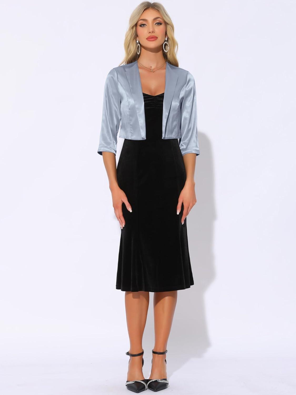 Allegra K Satin Cardigan for Women’s Open Front Elegant Formal 3/4 Sleeve Bolero Shrug Jacket(Black)