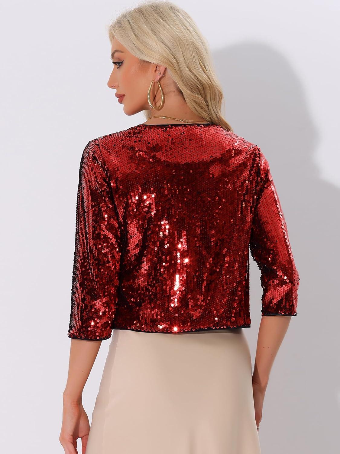 Allegra K Sequin Jacket for Women's Sparkly Party 3/4 Sleeve Open Front Crop Bolero Shrug Cardigan(Red)