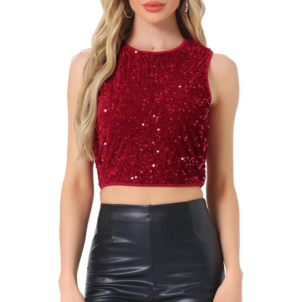 imageAllegra K Sequin Tops for Womens Sparkle Glitter Sleeveless Club Party Nightout Crop Tank TopRed