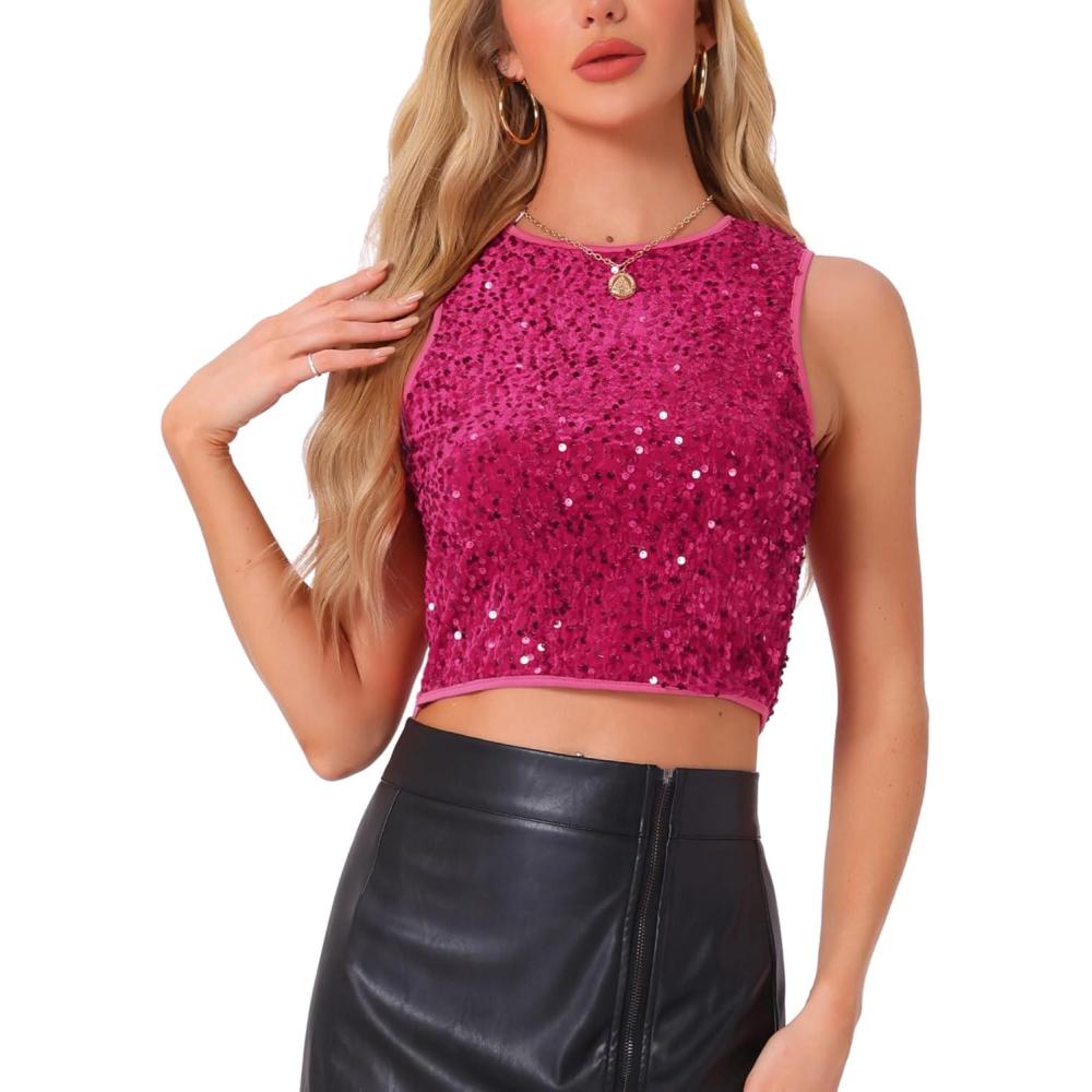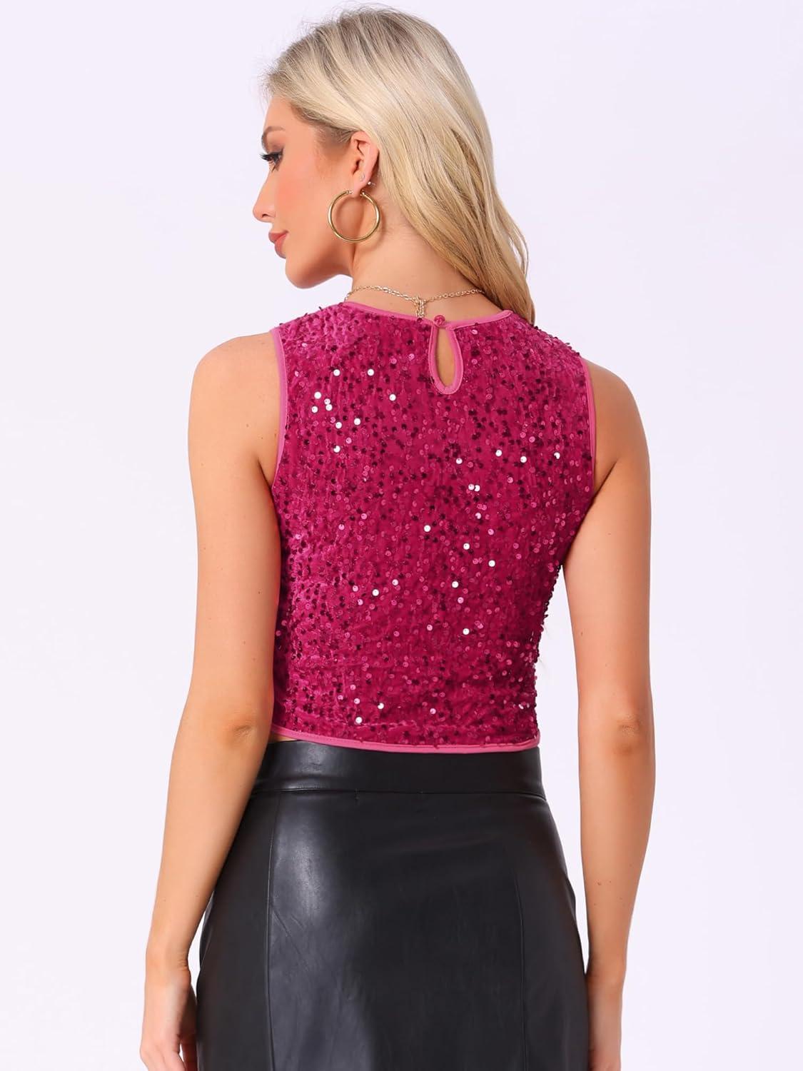 Allegra K Sequin Tops for Women’s Sparkle Glitter Sleeveless Club Party Nightout Crop Tank Top(Rose Red)