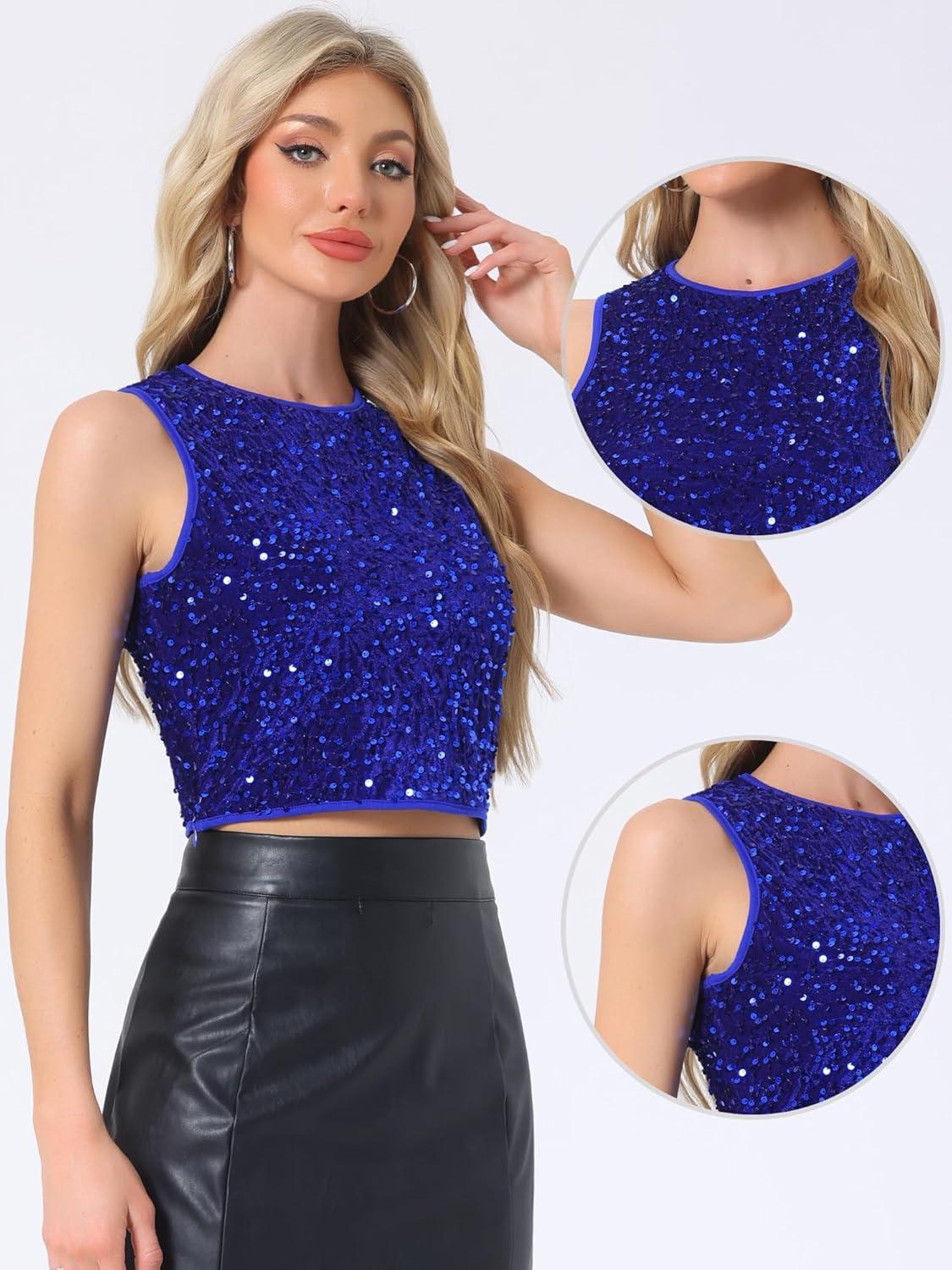 Allegra K Sequin Tops for Women's Sparkle Glitter Sleeveless Club Party Nightout Crop Tank Top(Royal Blue)