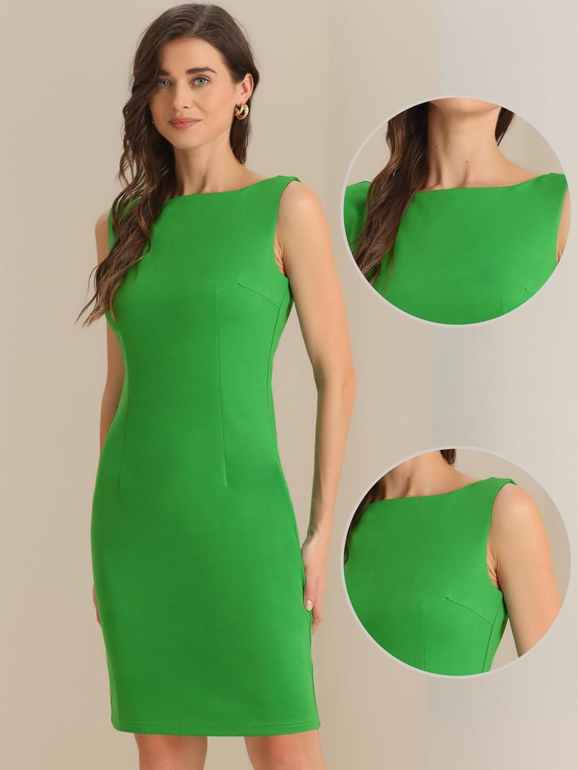 Allegra K Sheath Dress for Women's Business Teacher Sleeveless Boat Neck Professional Office Dresses(Grass Green)