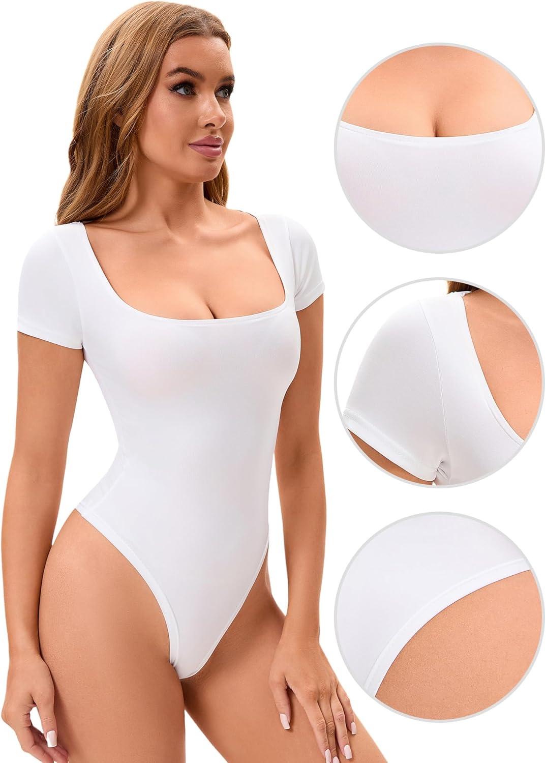 Allegra K Short Sleeve Bodysuits for Women U Neck Tummy Control Tops Shapewear Seamless Slim Fitted Clothing(White)