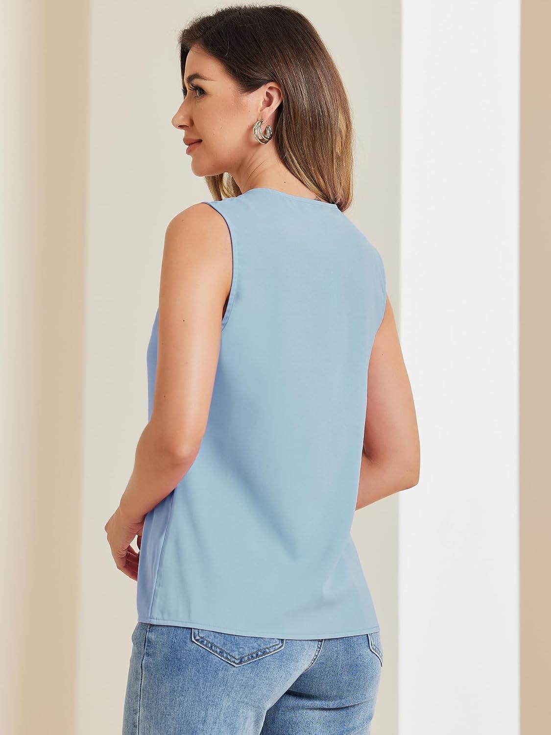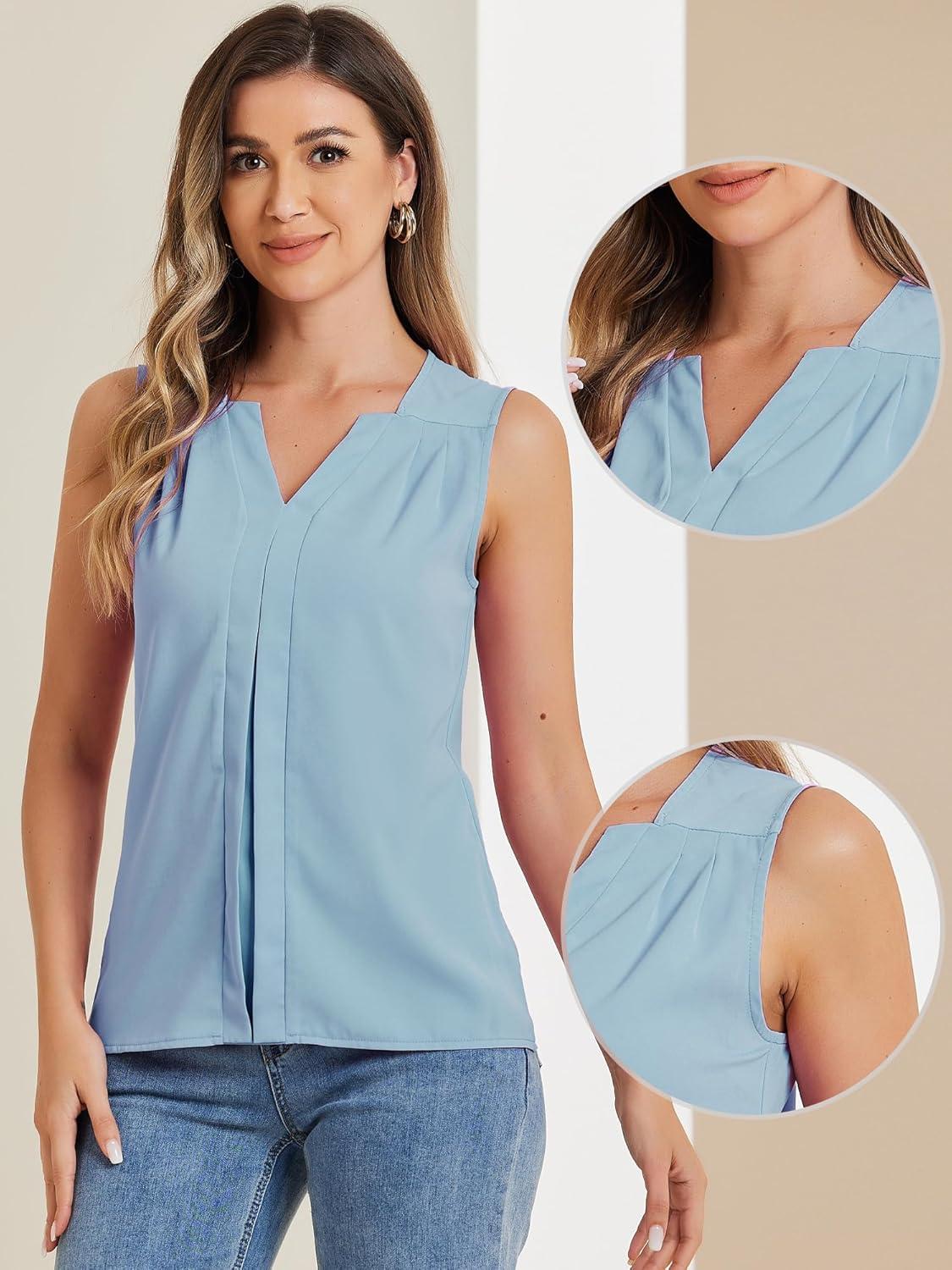 Allegra K Sleeveless Work Top for Women’s Elegant Pleated V Neck Blouse Shirt Tank Top(Gray Blue)