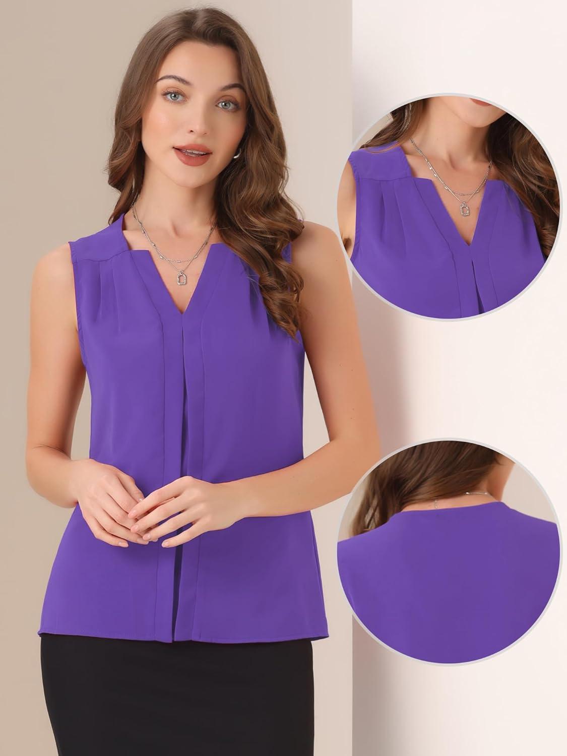 Allegra K Sleeveless Work Top for Women's Elegant Pleated V Neck Blouse Shirt Tank Top(Purple)