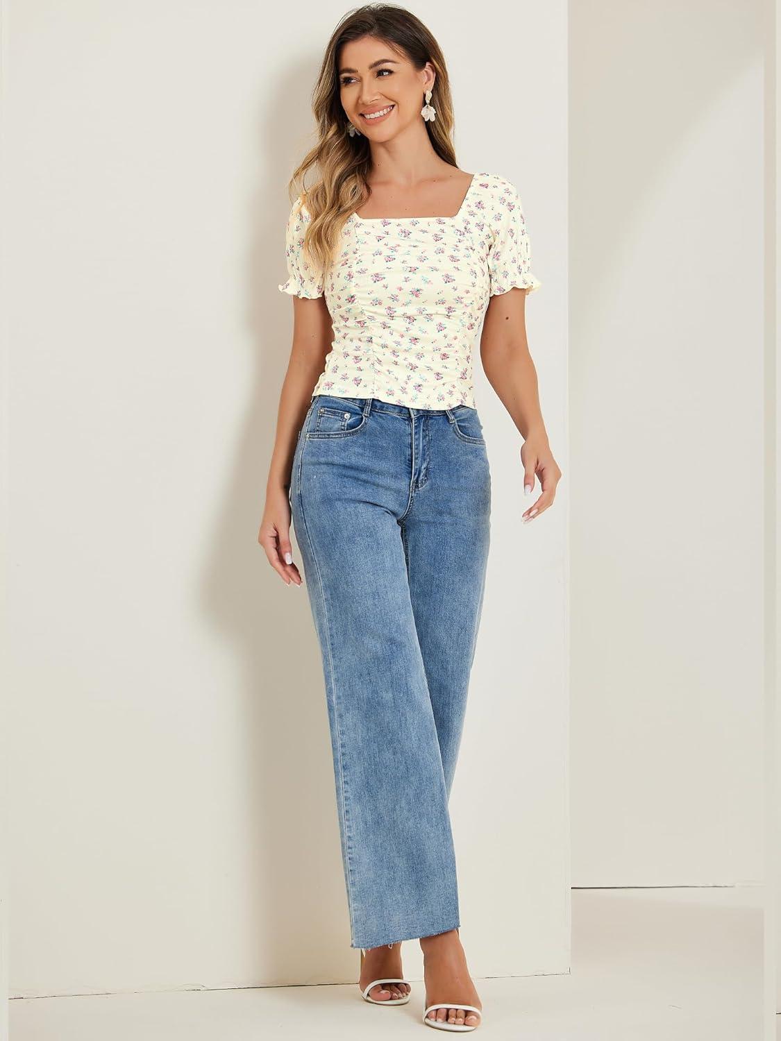 Allegra K Smocked Crop Top for Women’s Slim Fit Floral Peasant Blouse(Beige Yellow)