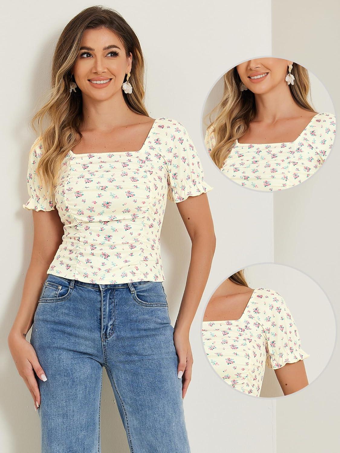 Allegra K Smocked Crop Top for Women's Slim Fit Floral Peasant Blouse(Beige Yellow)