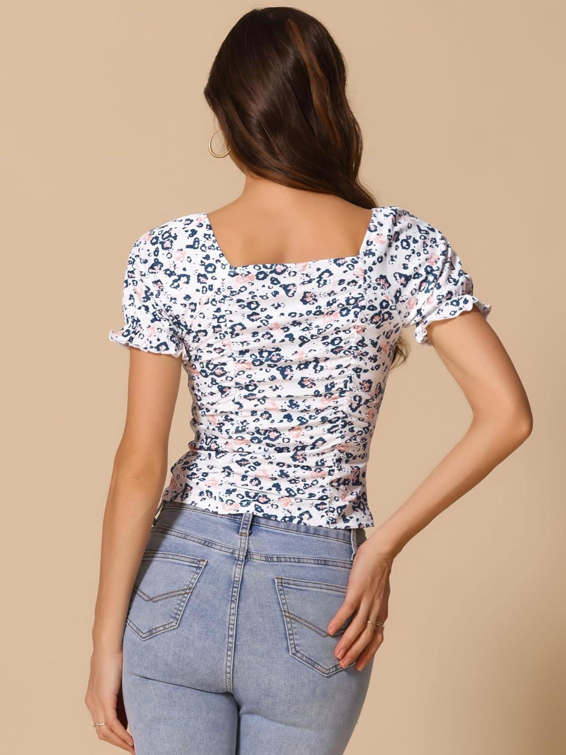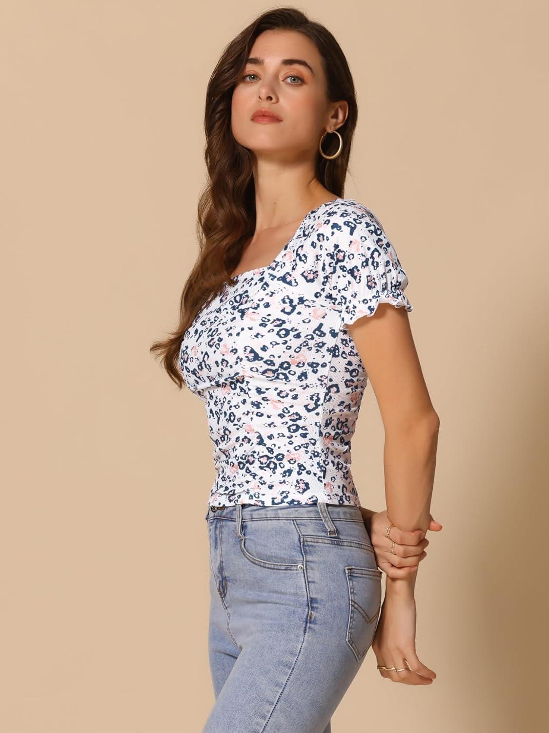 imageAllegra K Smocked Crop Top for Womens Slim Fit Floral Peasant BlouseWhite