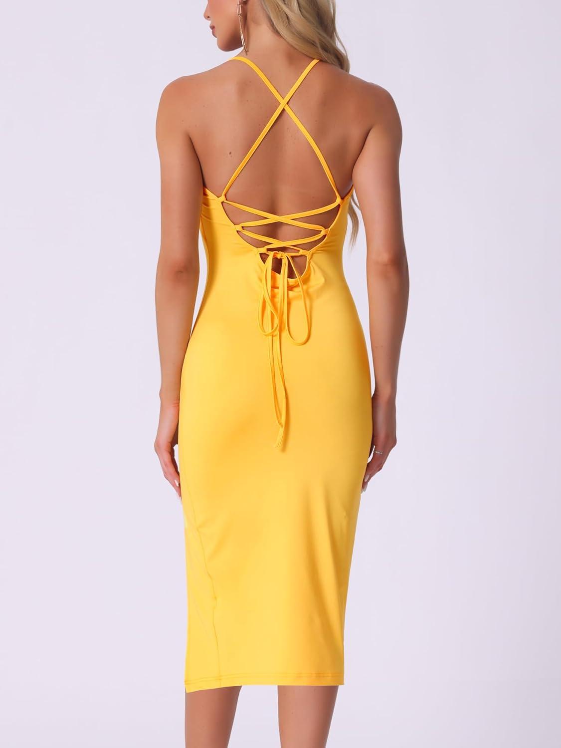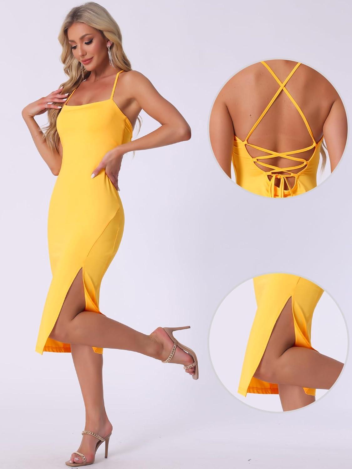 Allegra K Spaghetti Strap Dress for Women's Slim Fit Sleeveless Split Bodycon Cocktail Party Dress(Yellow)