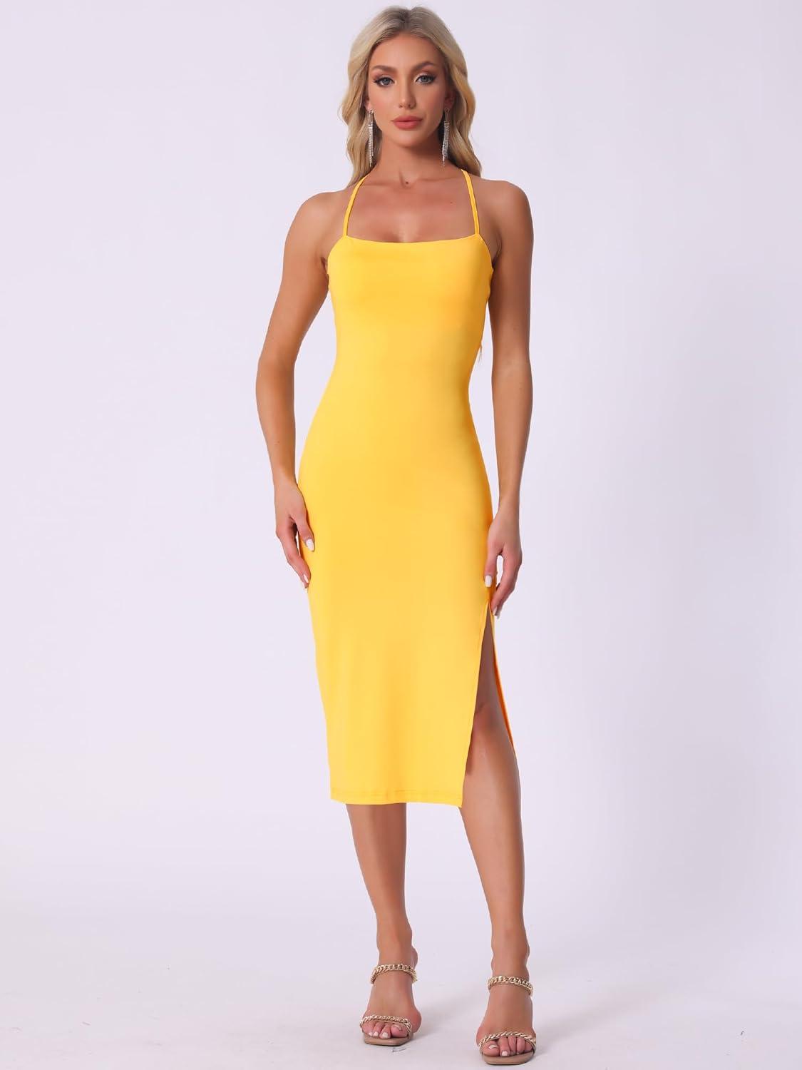 Allegra K Spaghetti Strap Dress for Women’s Slim Fit Sleeveless Split Bodycon Cocktail Party Dress(Yellow)