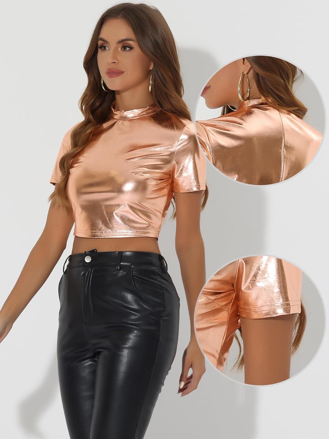 imageAllegra K Sparkle Tops for Womens Halloween Short Sleeve Mock Neck Party Metallic Crop TopMulticolor