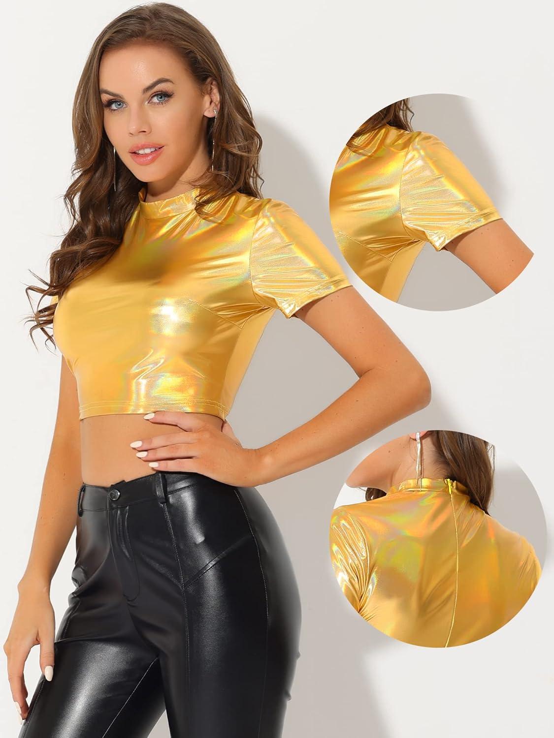 Allegra K Sparkle Tops for Women’s Halloween Short Sleeve Mock Neck Party Metallic Crop Top(Gold)