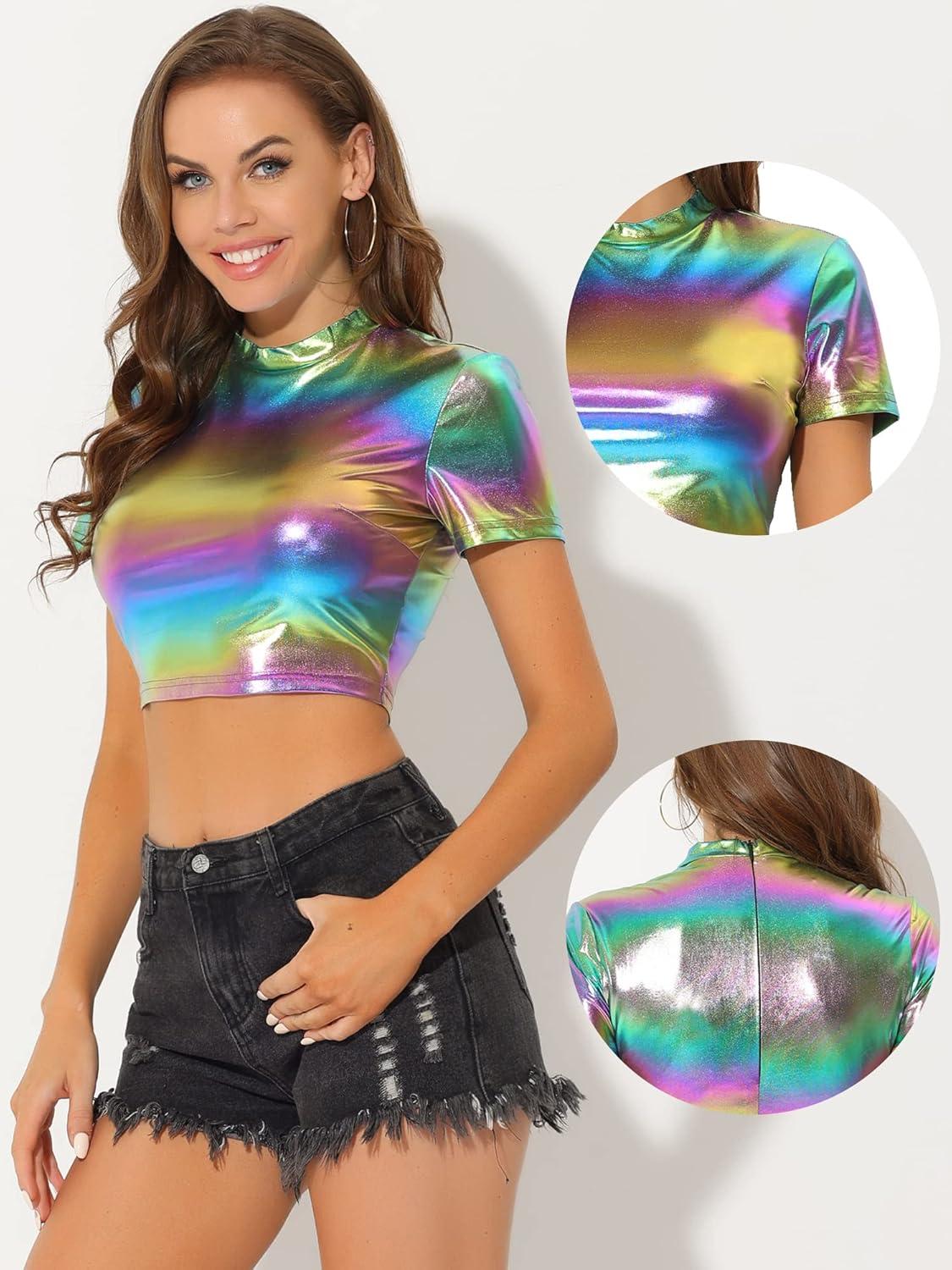 Allegra K Sparkle Tops for Women’s Halloween Short Sleeve Mock Neck Party Metallic Crop Top(Multicolor)