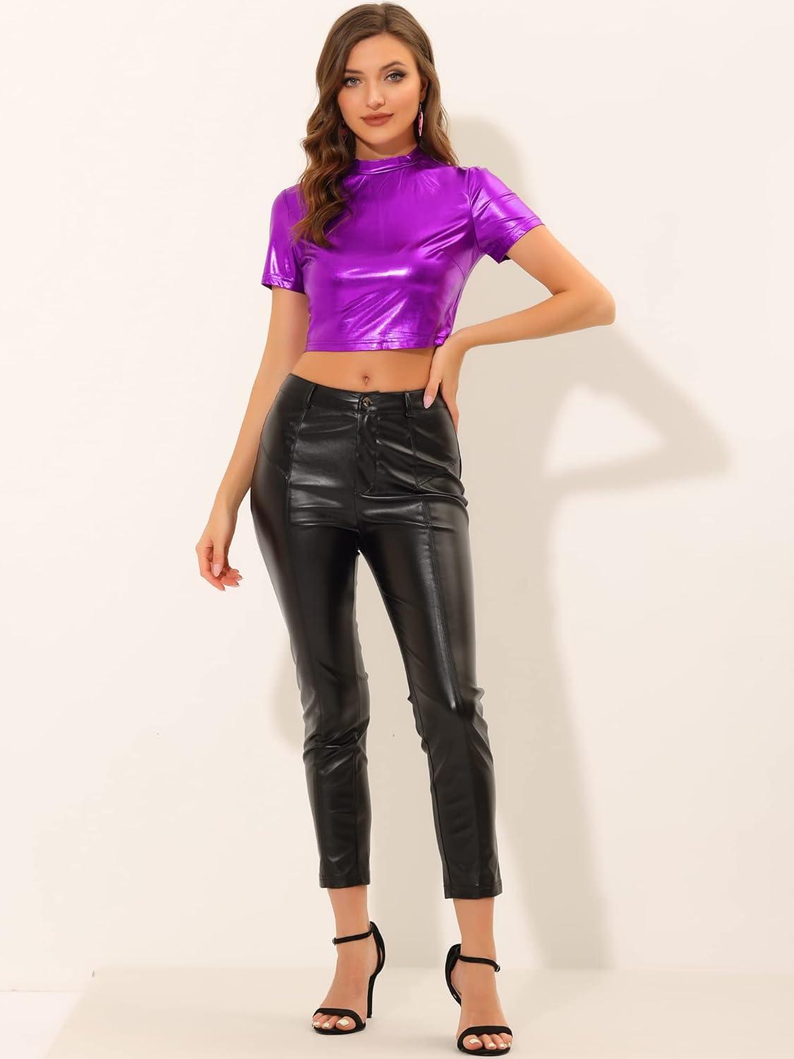 Allegra K Sparkle Tops for Women's Halloween Short Sleeve Mock Neck Party Metallic Crop Top(Purple)