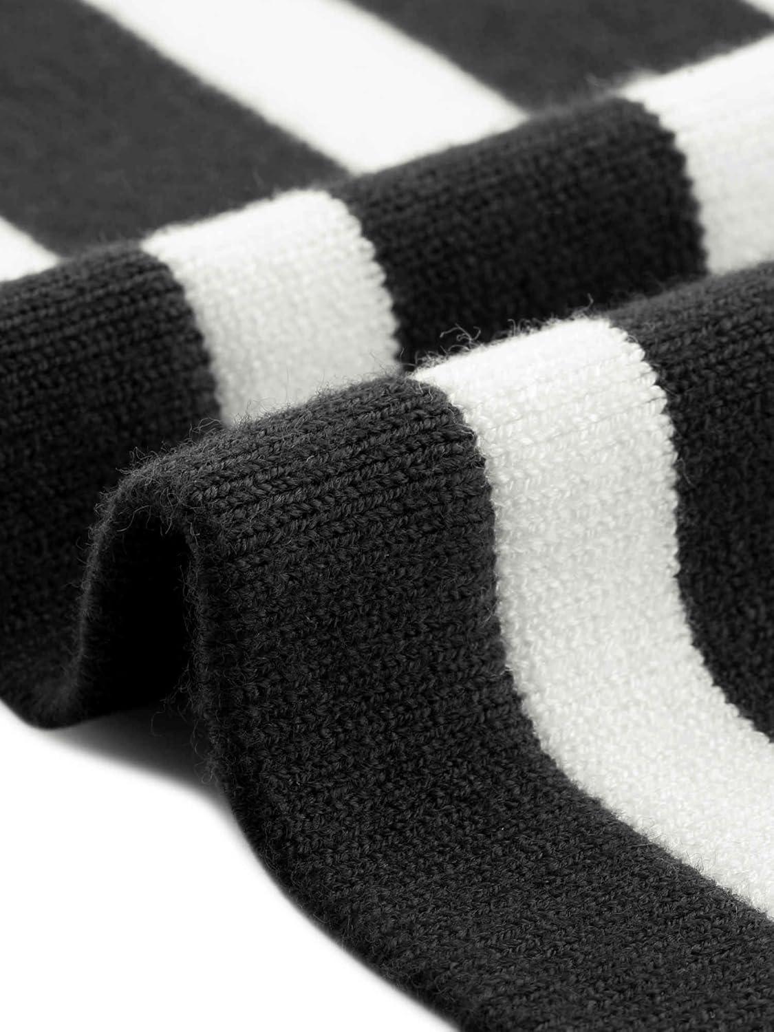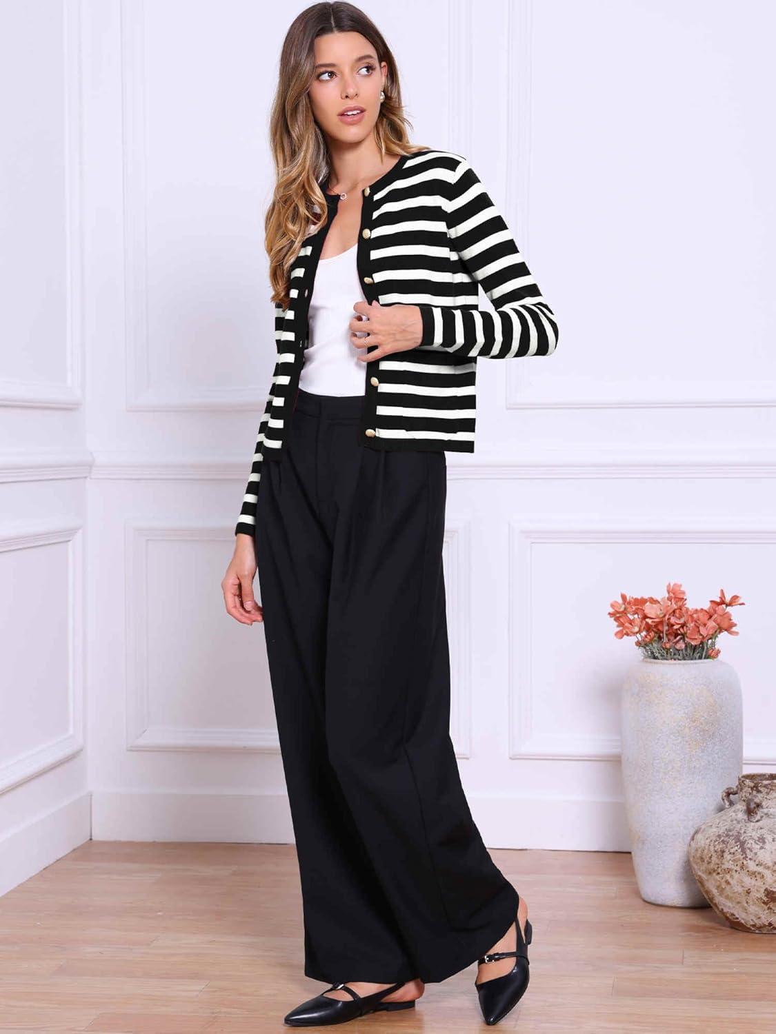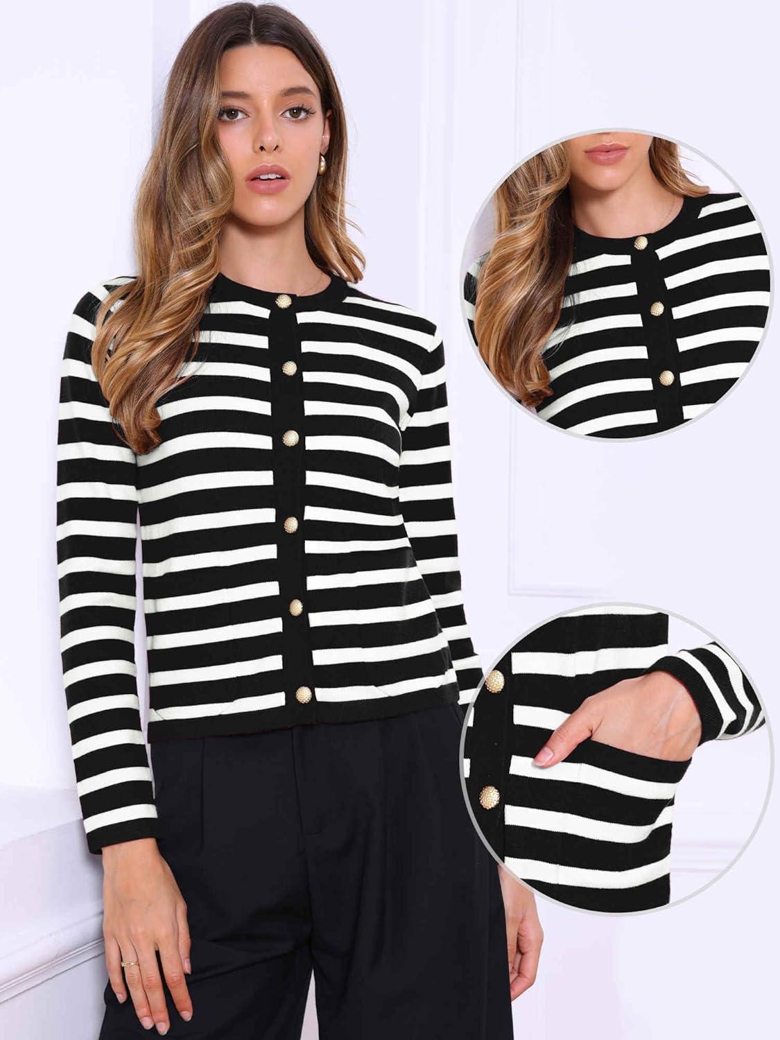 Allegra K Striped Cardigan Sweaters for Women’s Lightweight Crew Neck Button Down Knit Jackets(Black White)