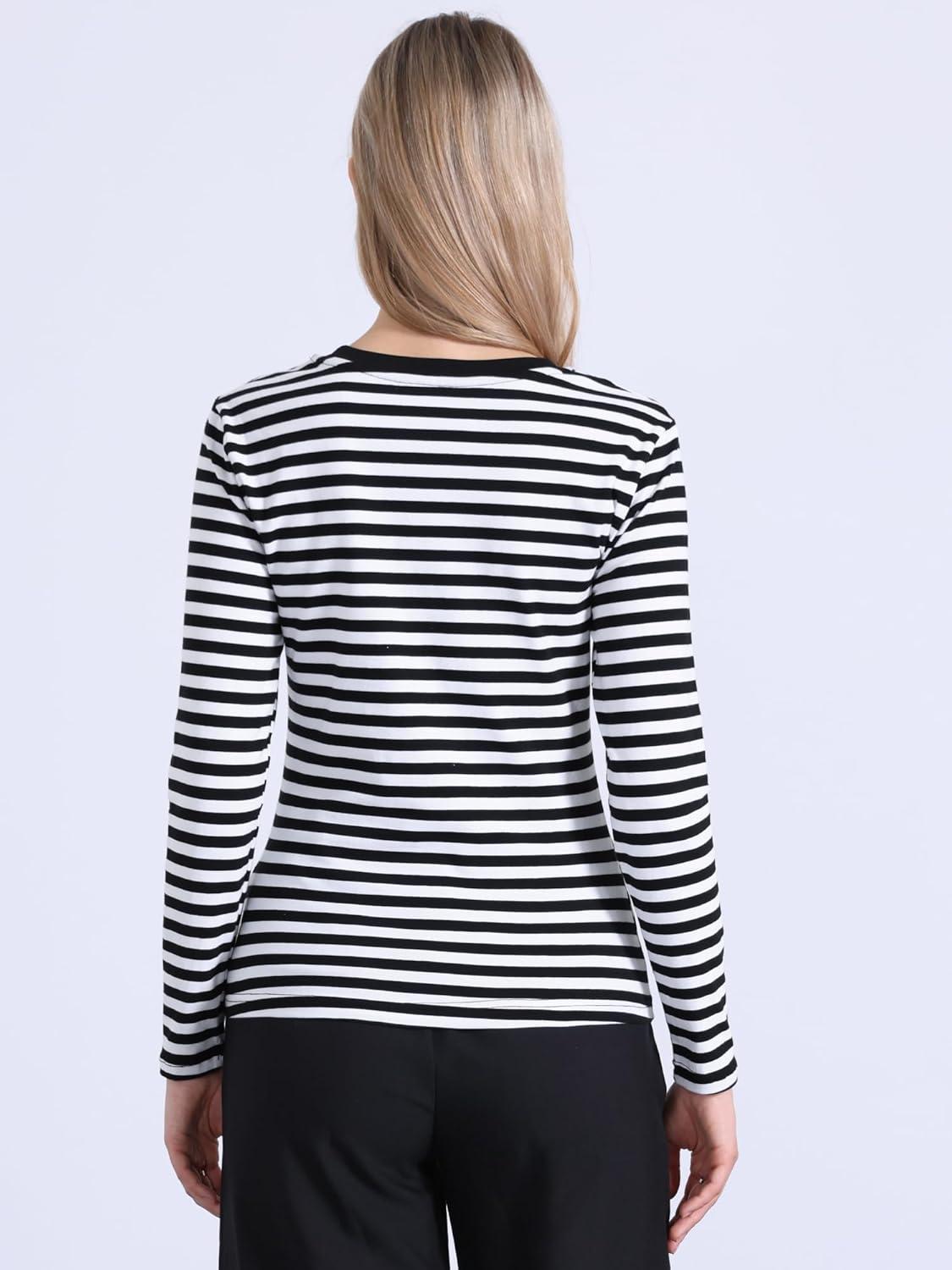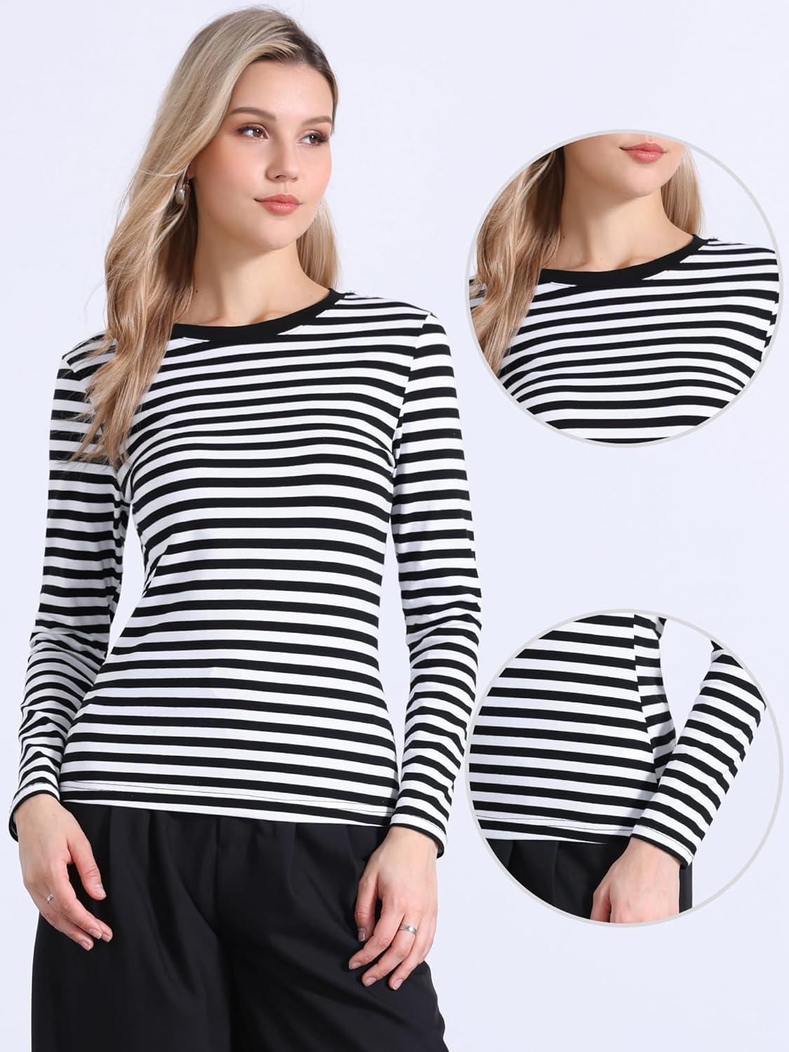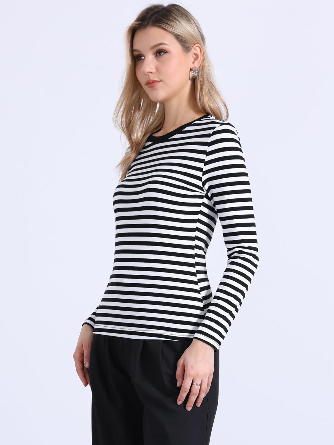 Allegra K Striped t Shirts for Women Long Sleeve Tops Crew Neck Fitted Tees Casual Trendy Outfits(Black White Stripe)