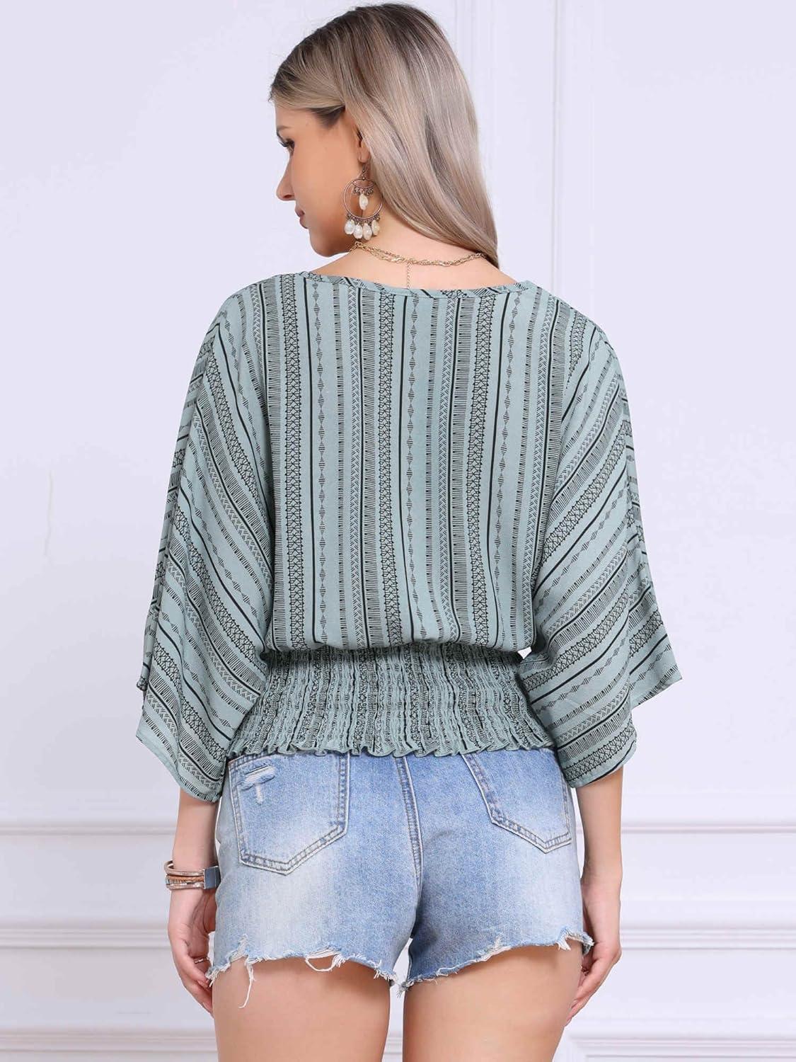 Allegra K Tops for Women’s Summer Boho V Neck Print Chiffon Top Smocked Batwing Dolman Sleeve Blouses(Light Gray Green)